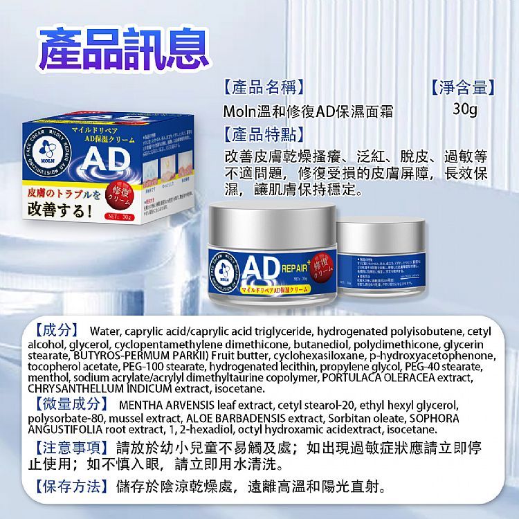 Moln 溫和修復AD保濕面霜(30g) 乳液 乳霜 肌膚保養 小巧包裝 隨身攜帶 修護【小三美日】DS025306單一Facial Moisturizer小三美日