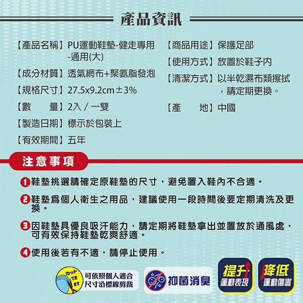 PU運動鞋墊-健走專用(1雙入) 款式可選 顏色隨機 福可【小三美日】D617163男性用|女性用Shoe Insoles小三美日