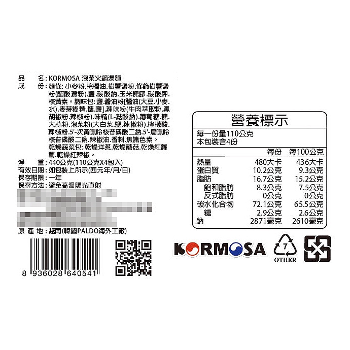 韓國 KORMOSA 泡菜火鍋湯麵(110g x 4入/整袋裝)【小三美日】D640541單一規格Instant Noodles小三美日
