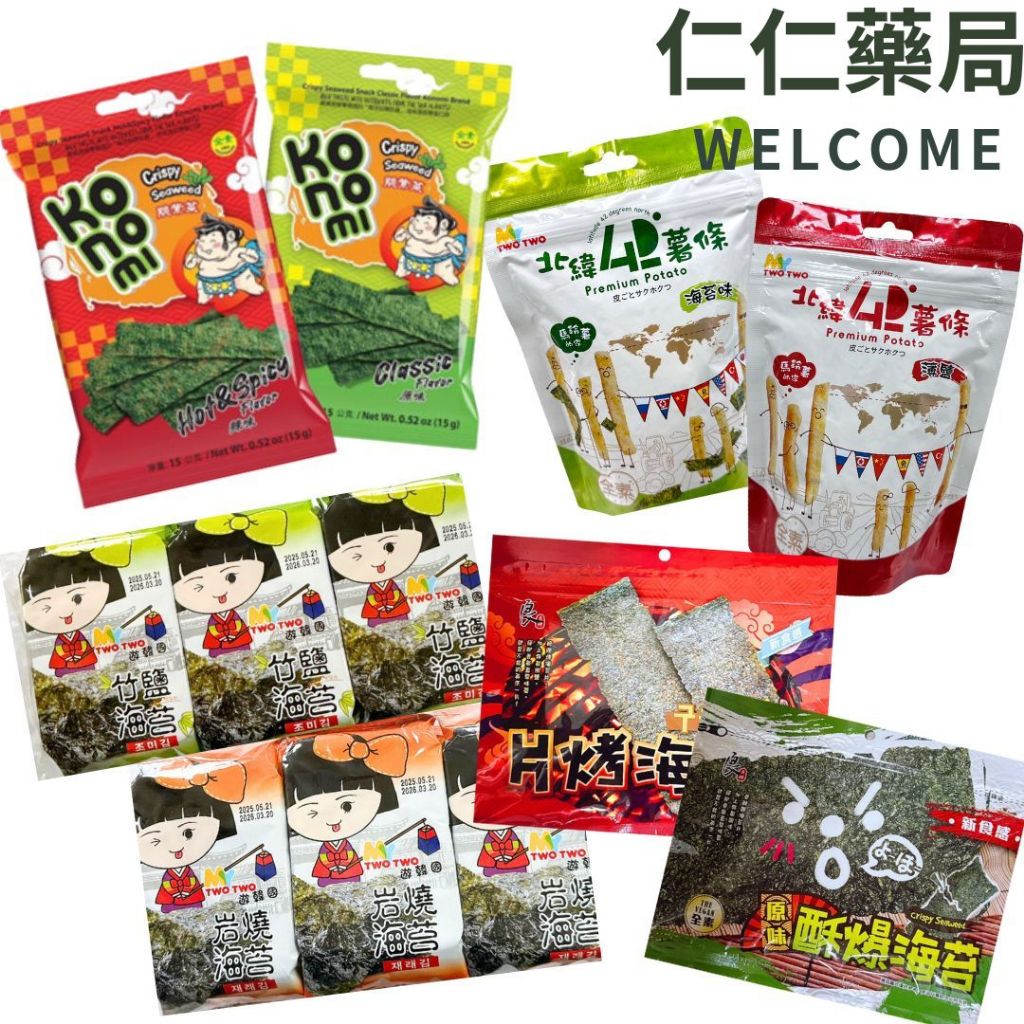 泰國Konomi 相撲手海苔 脆紫菜 北緯薯條 良澔片烤海苔 酥爆海苔【仁仁藥局】韓國海苔 泰國薯條 海苔片良澔酥爆海苔(原味)|良澔片烤海苔(椒鹽口味)|相撲手海苔脆紫菜-原味|相撲手海苔脆紫菜-辣味|Two竹鹽海苔6入/包|Two炭燒海苔6入/包|北緯(海苔)薯條90g/包|北緯(薄鹽)薯條90g/包Seaweed仁仁藥局線上購物