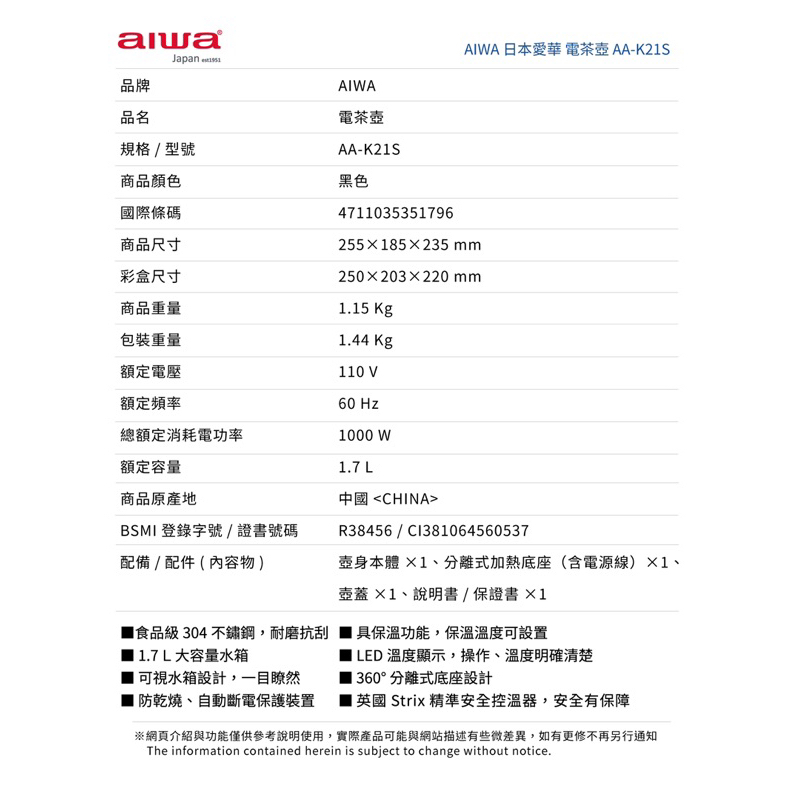 AIWA 愛華 1.7L 11段控溫電茶壼 AA-K21S 免運 全新公司貨保固Aiwa電茶壺AA-K21SKettles日本BN Beauty Queen