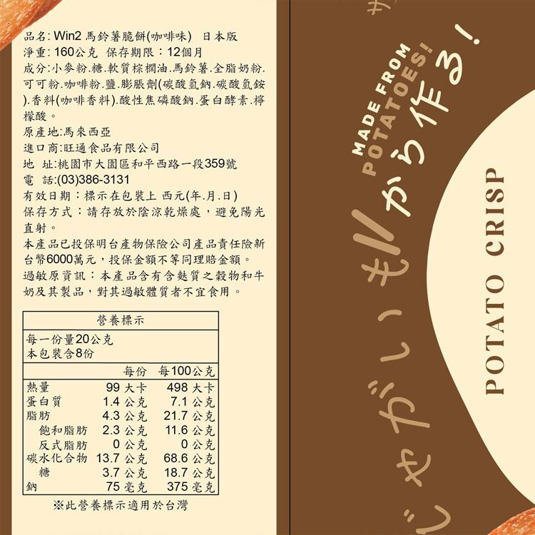 馬來西亞 WIN2 馬鈴薯脆餅(160g) 洋芋片 餅乾 零食 零嘴 辦公室零食 脆餅 薯片【小三美日】DS025484燒烤味|蔬菜味|咖啡味|洋蔥酸奶味|喜瑪拉雅鹽味Biscuits, Cookies & Wafers小三美日
