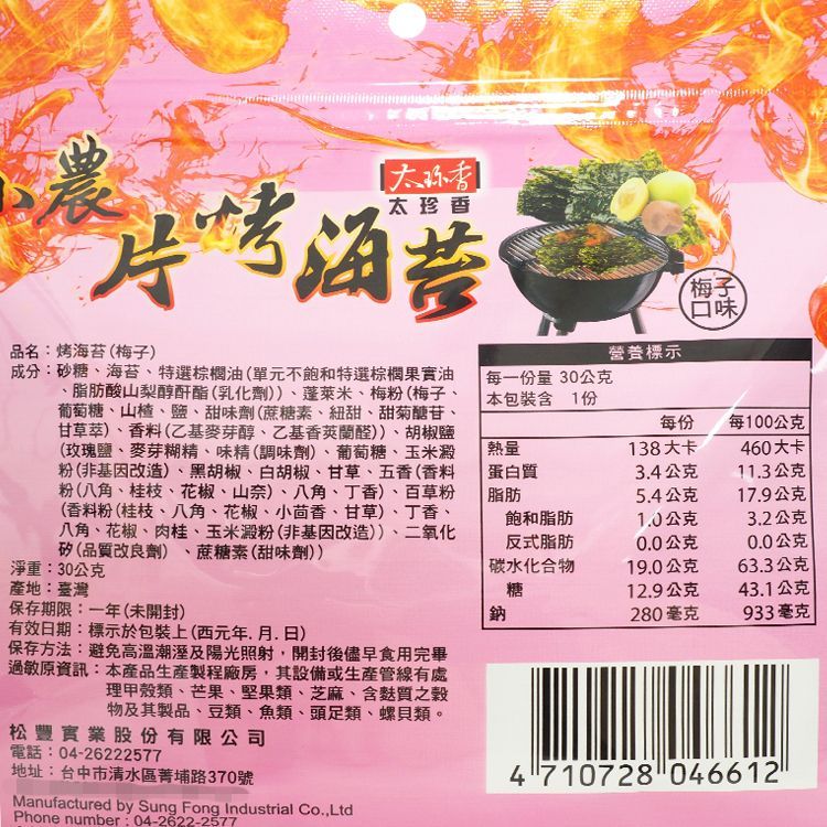 太珍香 小農片烤海苔(30g) 全素 烤海苔 海苔 海苔片 酥脆海苔 小農片海苔 零食【小三美日】DS022815椒鹽口味|香酥|梅子口味Seaweed小三美日