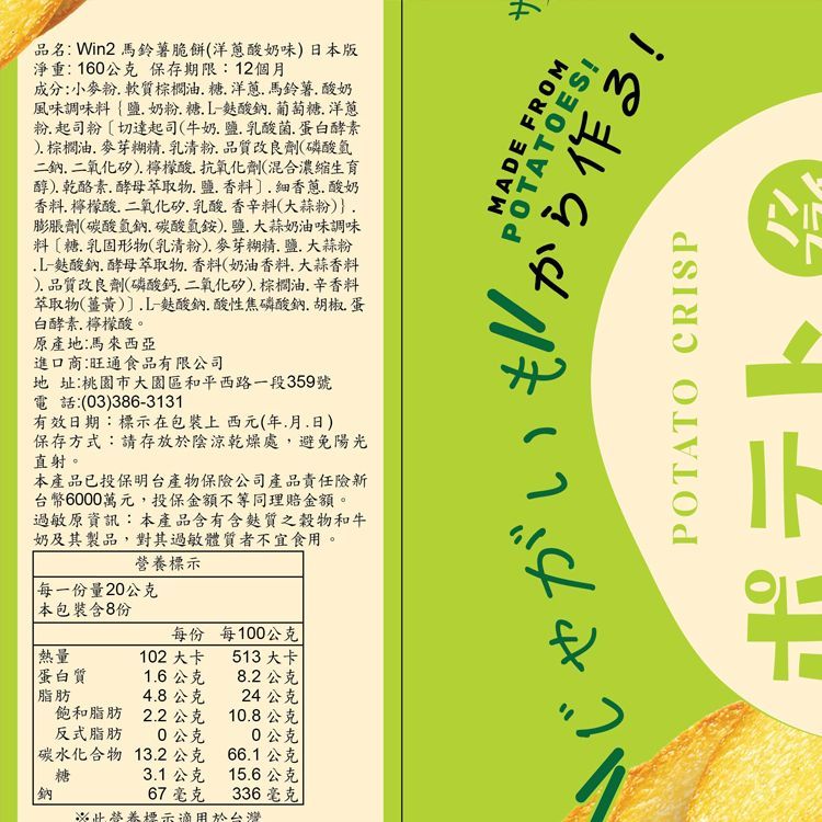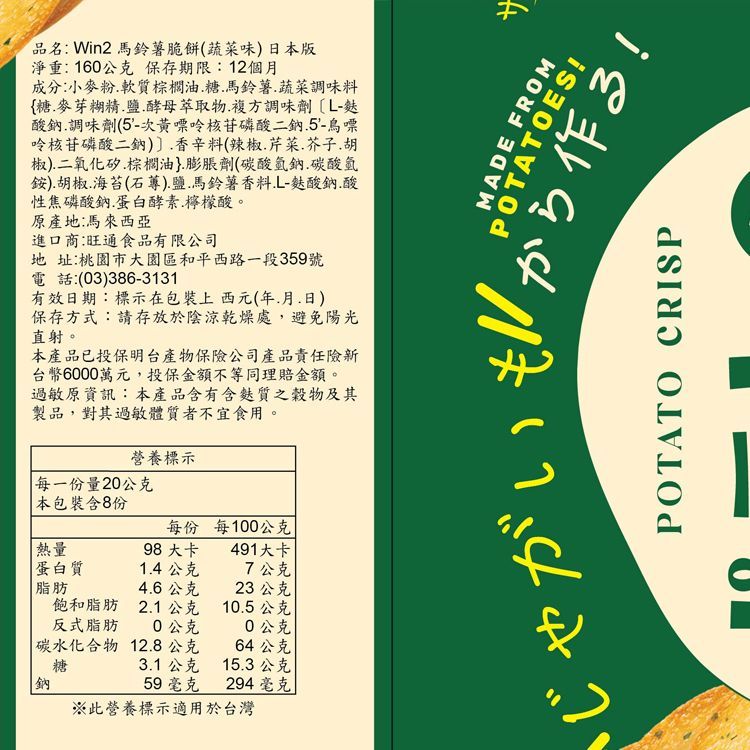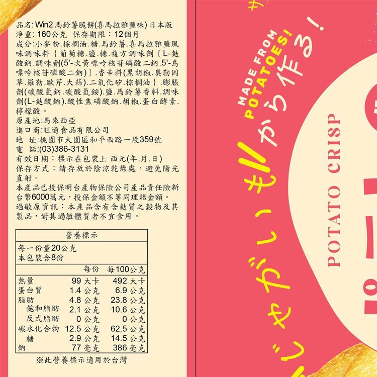 馬來西亞 WIN2 馬鈴薯脆餅(160g) 洋芋片 餅乾 零食 零嘴 辦公室零食 脆餅 薯片【小三美日】DS025484