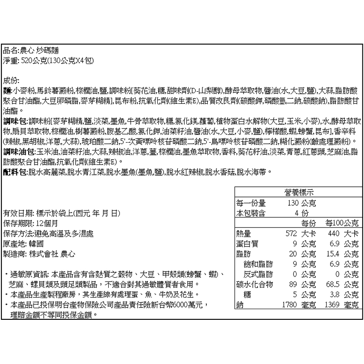韓國 農心 辣味炒碼麵130g*4包(整袋裝) 泡麵 團購 韓國泡麵 韓國炒麵 宵夜 美食【小三美日】D033787單一款式Instant Noodles小三美日
