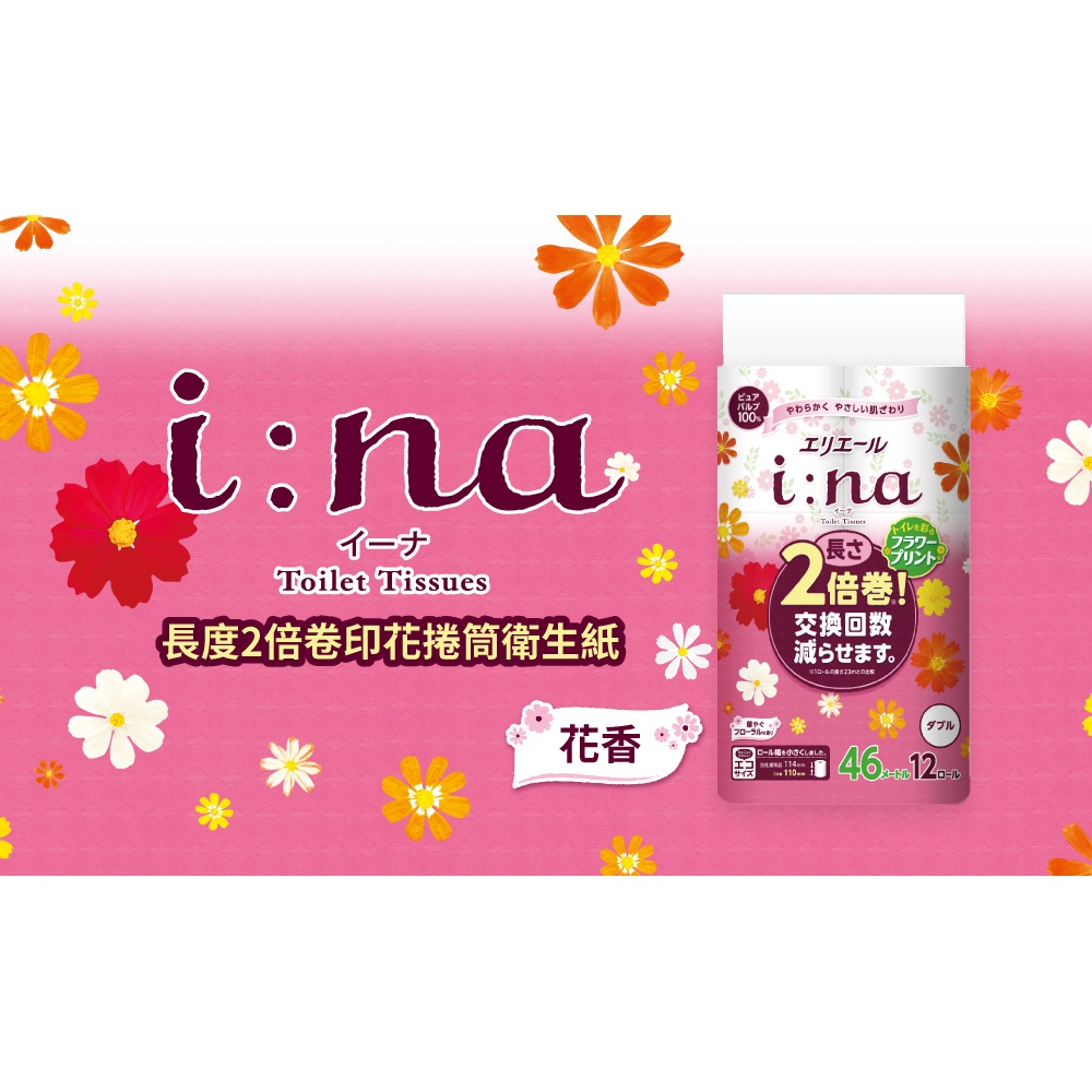 日本大王elleair i:na2倍巻印花捲筒衛生紙46M-花香 (12捲/包) 廁所廁紙可溶水(包購)