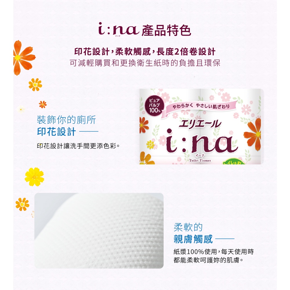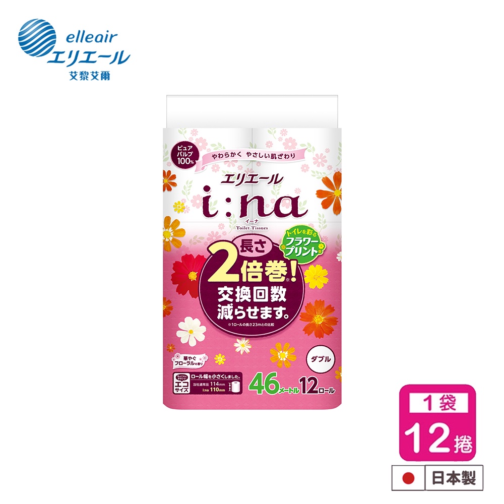 日本大王elleair i:na2倍巻印花捲筒衛生紙46M-花香 (12捲/包) 廁所廁紙可溶水(包購)花香(12捲)x1包|花香(12捲)x2包(超取上限)Tissue & Paper Towels日本大王elleair 官方旗艦店