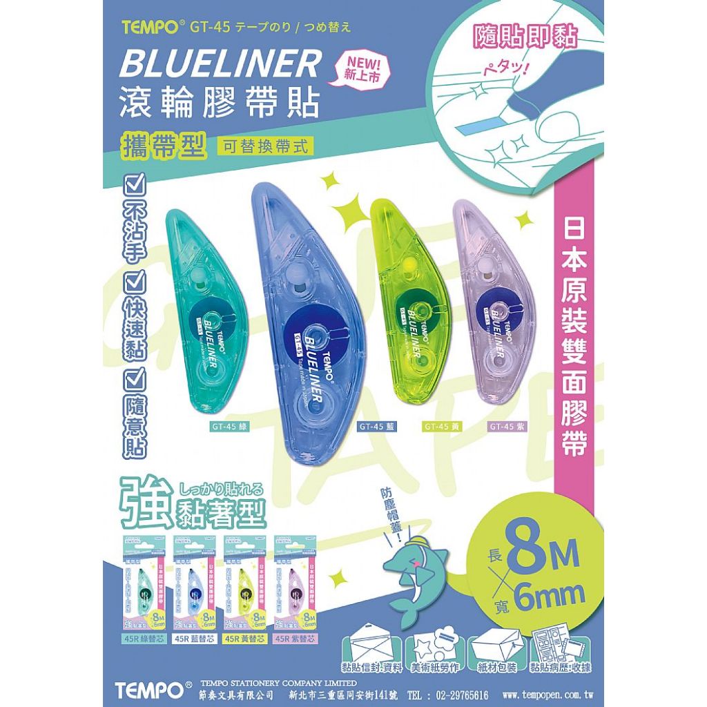 Tempo 節奏 BLUELINE滾輪膠帶貼(MGT-45)1+1(1組入) 豆豆貼 黏貼【小三美日】DS024337