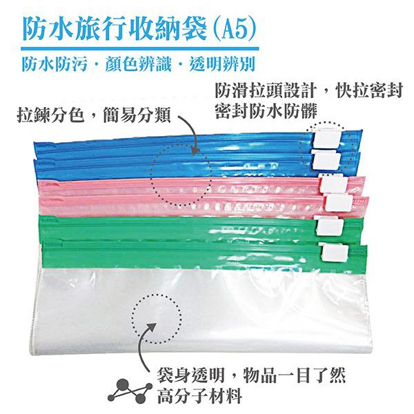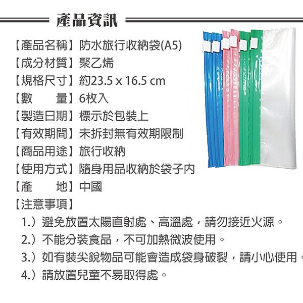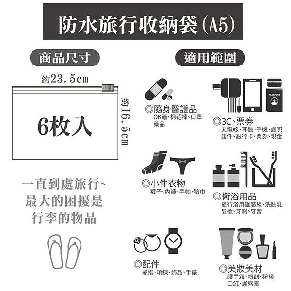 防水旅行收納袋(A5)6枚入 旅行 旅遊 出差 出國 旅行收納 收納包 防水收納 密封袋 拉鍊【小三美日】D373386單一規格Travel Organizers小三美日