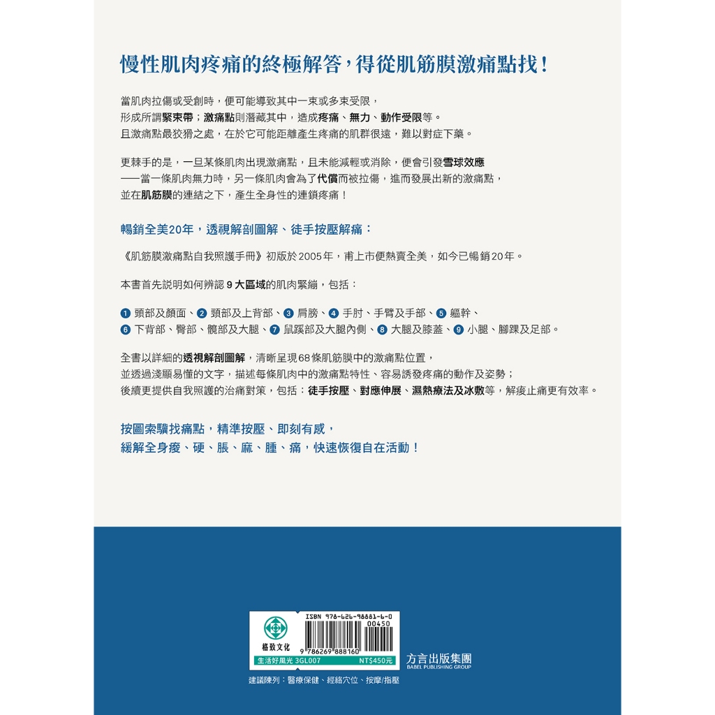 肌筋膜激痛點自我照護手冊 (20年暢銷紀念版): 按圖索驥找痛點,對症按壓秒舒緩,快速恢復自在活動!【格致文化】肌筋膜激痛點自我照護手冊 (20年暢銷紀念版): 按圖索驥找痛點,對症按壓秒舒緩,快速恢復自在活動!【格致文化】Medical方言出版集團_Babel Publishing Group