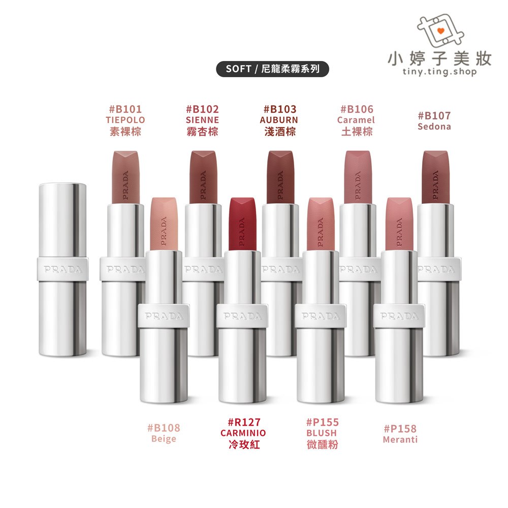PRADA 尼龍柔霧唇膏 3.8g 多款可選 小婷子美妝 SoftB102 Sienne(Soft)|B103 Auburn(Soft)|R127 Carminio(Soft)|P155 Blush(Soft)|其他色號需代購(請聊聊詢問)|B101 Tiepolo(Soft)|B106 Caramel(Soft)|P158 Meranti(Soft)|B107 Sedona(Soft)|B108 Beige(Soft)|P160 Blossom Pink|P161 Sunset PinkLips小婷子美妝
