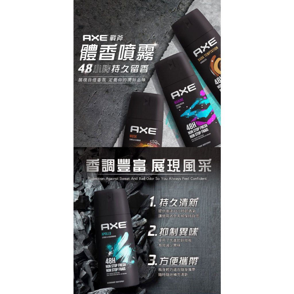 AXE 戰斧 男用 體香 噴霧 150ml 體香劑 體味管理 除臭 體香噴霧 【小髮廊】空運禁送 DS020640黯黑經典|黑夜騎士|星際迷情|深海悠香|黑街誘惑|淡雅麝香Body Deodorants小髮廊 Hair Salon