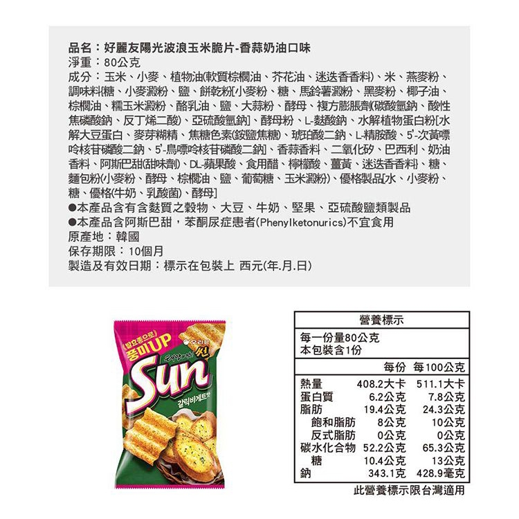 好麗友 陽光波浪 玉米脆片 (香辣/香蒜奶油)80g 玉米片 洋芋片 韓國 零食 零嘴 餅乾【小三美日】DS026991香辣口味80g|香蒜奶油口味80gChips & Crisps小三美日