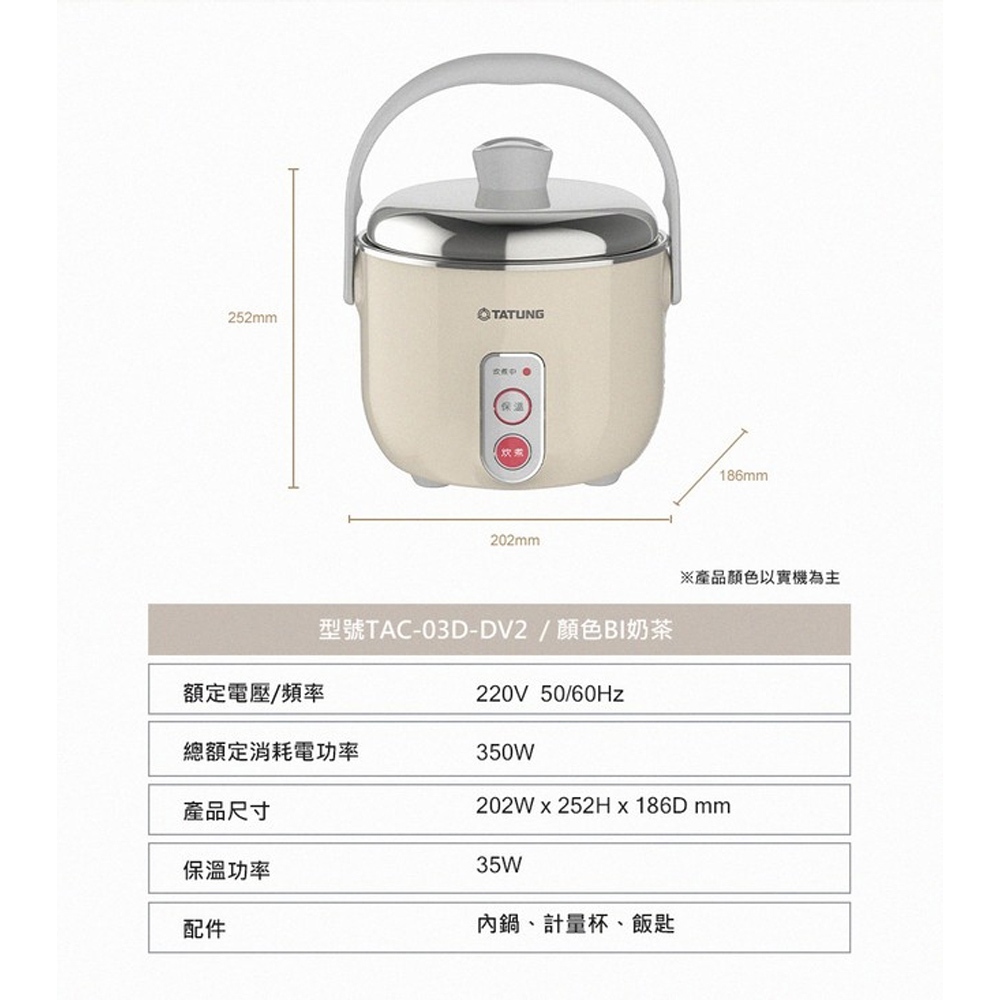 TATUNG 大同 3人份 異電壓220V 不鏽鋼電鍋 奶茶色 (僅國外適用) TAC-03D-DV2BITATUNG 大同 3人份 異電壓220V 不鏽鋼電鍋 奶茶色 (僅國外適用) TAC-03D-DV2BIRice Cookers元元家電二館