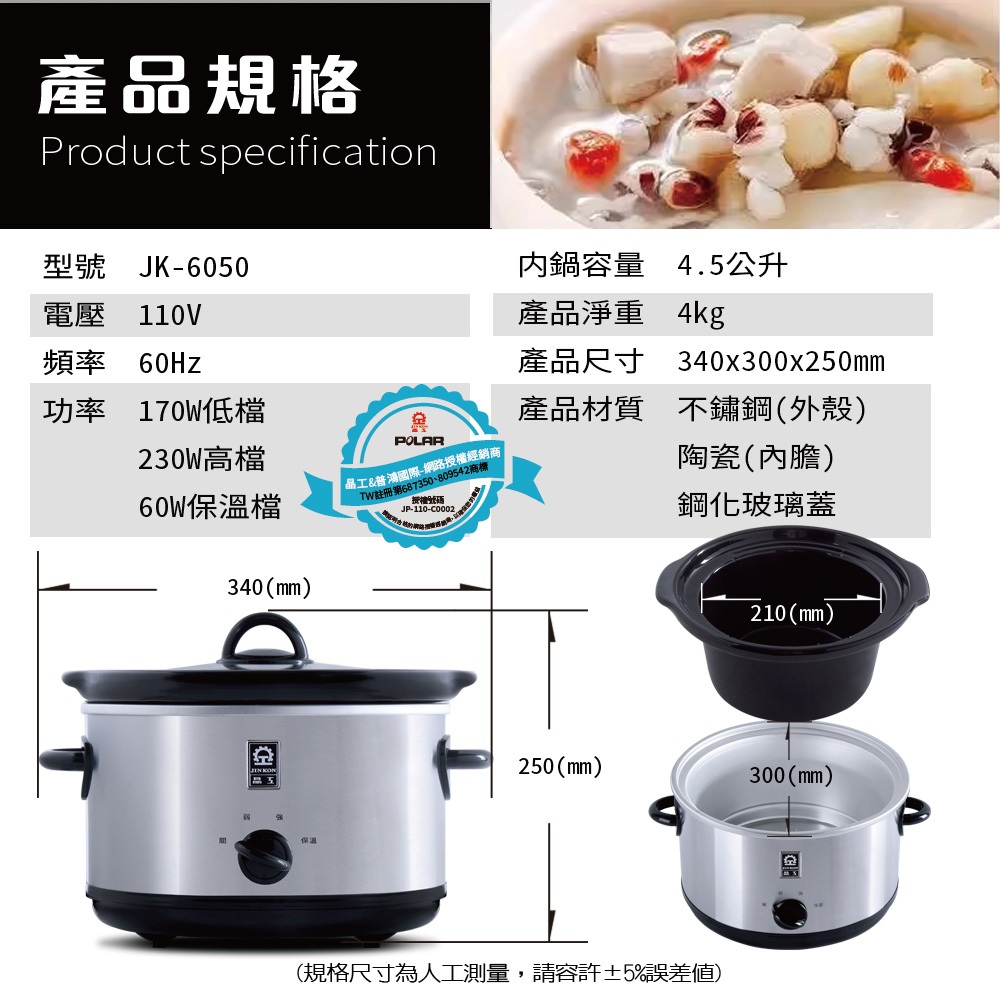 【晶工 Jinkon】4.5L陶瓷慢燉電鍋 JK-6050【晶工 Jinkon】4.5L陶瓷慢燉電鍋 JK-6050Slow Cookers & Sous Vide Machines元元生活家電館