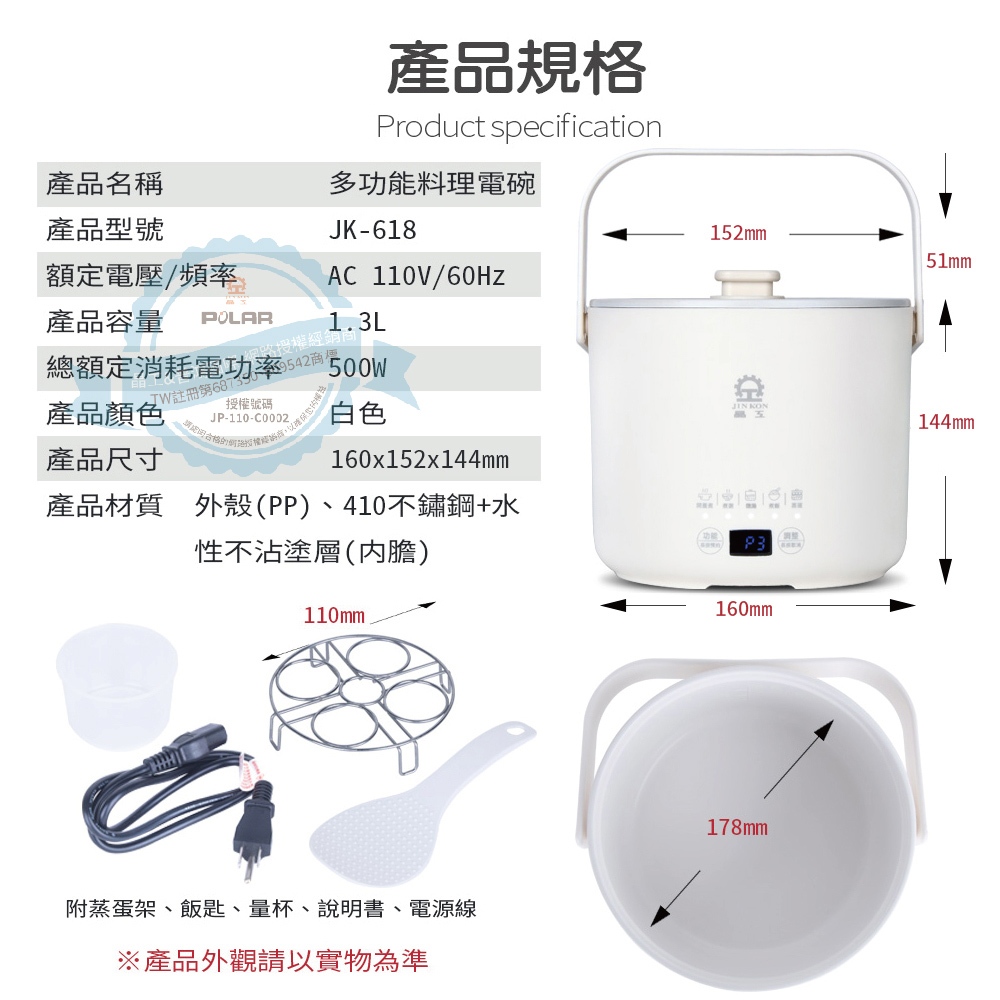晶工 Jinkon 1.3L多功能料理電碗(白色) JK-618 / JK-618-W晶工 Jinkon 1.3L多功能料理電碗(白色) JK-618 / JK-618-WMulti-function Cookers元元家電二館