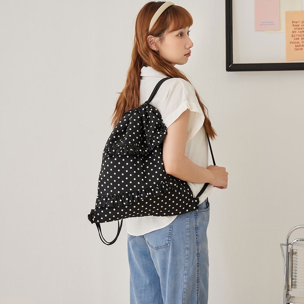 天藍小舖-黑白小圓點荷葉邊束口後背包-共2色-A12122302
