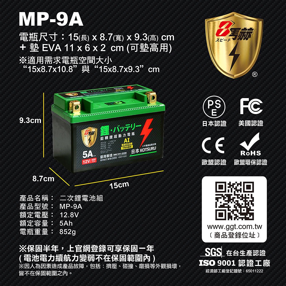【KOTSURU】MP-9A 8馬赫 鉛轉鋰超動力機車電瓶 鋰鐵啟動電池 12V 300CCA 台灣製造