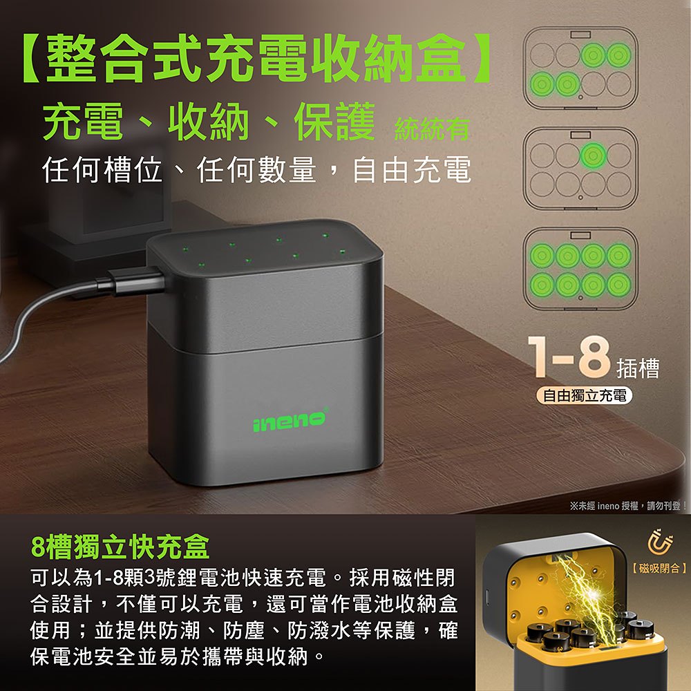 【ineno】3號/AA 恆壓可充式1.5V鋰電池全新特大能量3700mWh8入+(3號8槽)AI隨身收納盒充電器【ineno】3號/AA 恆壓可充式1.5V鋰電池全新特大能量3700mWh8入+(3號8槽)AI隨身收納盒充電器日本KOTSURU-便利速達