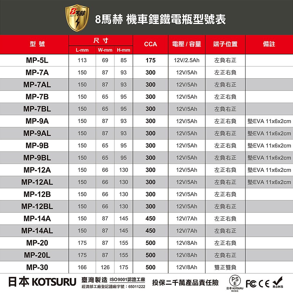 【KOTSURU】MP-7A 8馬赫 鉛轉鋰超動力機車電瓶 鋰鐵啟動電池 12V 300CCA 台灣製造【KOTSURU】MP-7A 8馬赫 鉛轉鋰超動力機車電瓶 鋰鐵啟動電池 12V 300CCA 台灣製造Batteries & Accessories日本KOTSURU-便利速達