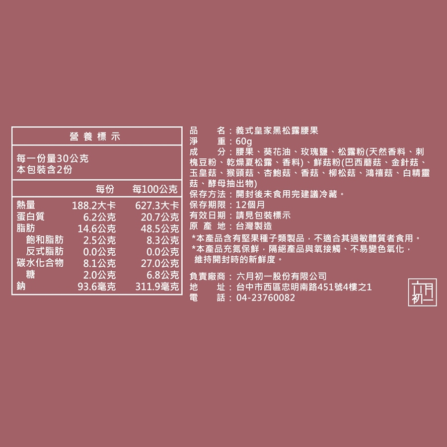【六月初一】義式皇家黑松露腰果 (30g/袋 2袋/盒)【六月初一】義式皇家黑松露腰果 (30g/袋 2袋/盒)Nuts六月初一8結蛋捲