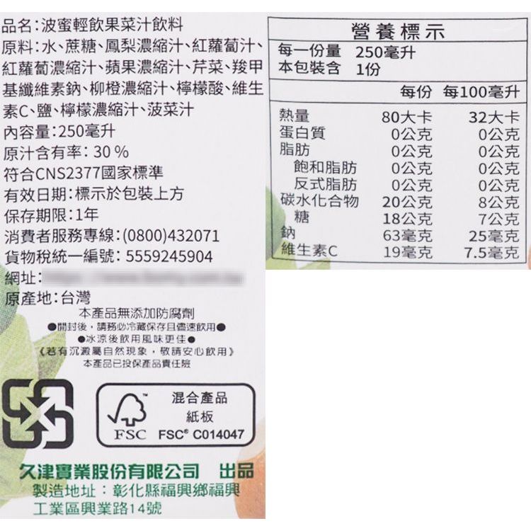 波蜜 輕飲果菜汁 (250ml) 蔬果汁 波蜜果菜汁 果菜汁 果汁 飲料 飲品 露營 野餐【小三美日】DS027093單一Juice & Juice Vinegar小三美日