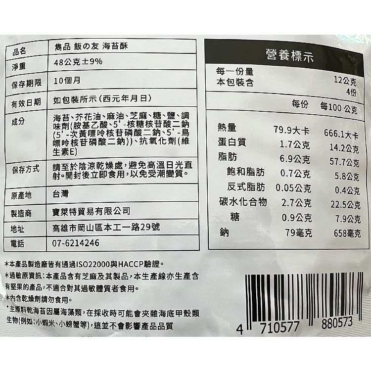 雋品 HiBs 飯友海苔酥(48g)【小三美日】DS019674單一Seaweed小三美日