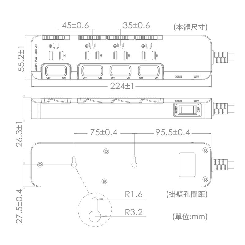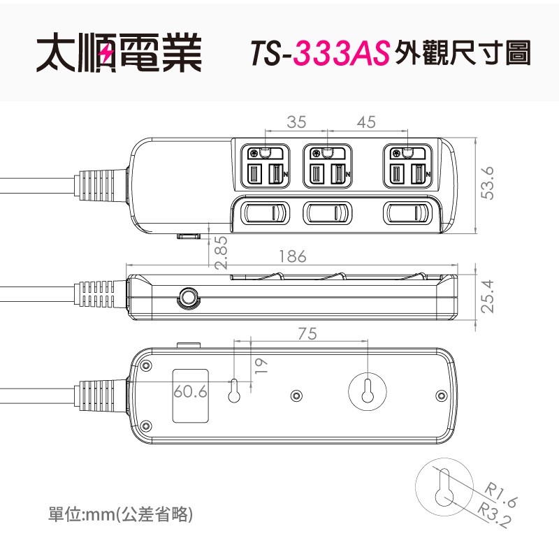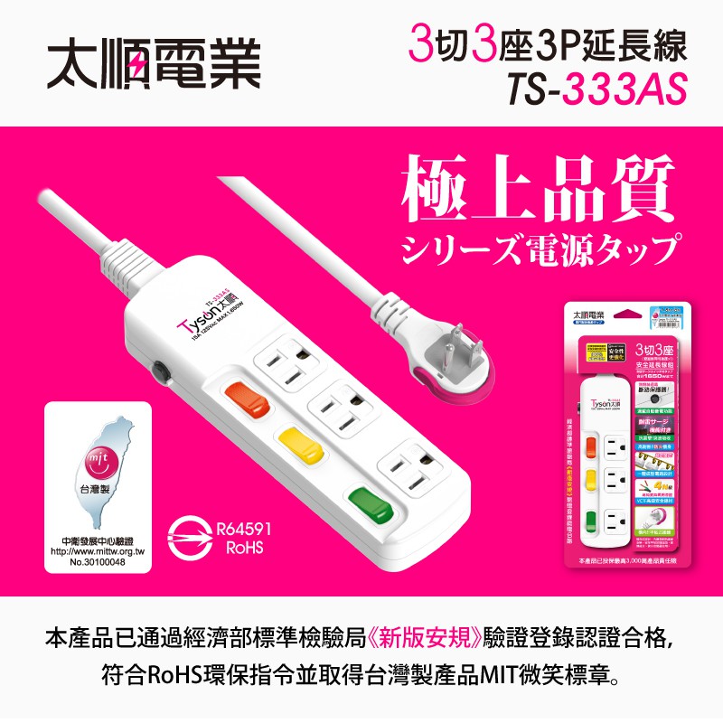 太順電業TS-333AS 3孔3開3插防雷擊延長線插座1.8M-4.5M 延長線插座 延長線1.8M|2.7M|4.5MElectric Sockets & Extension Cords太順延長線品牌旗艦館