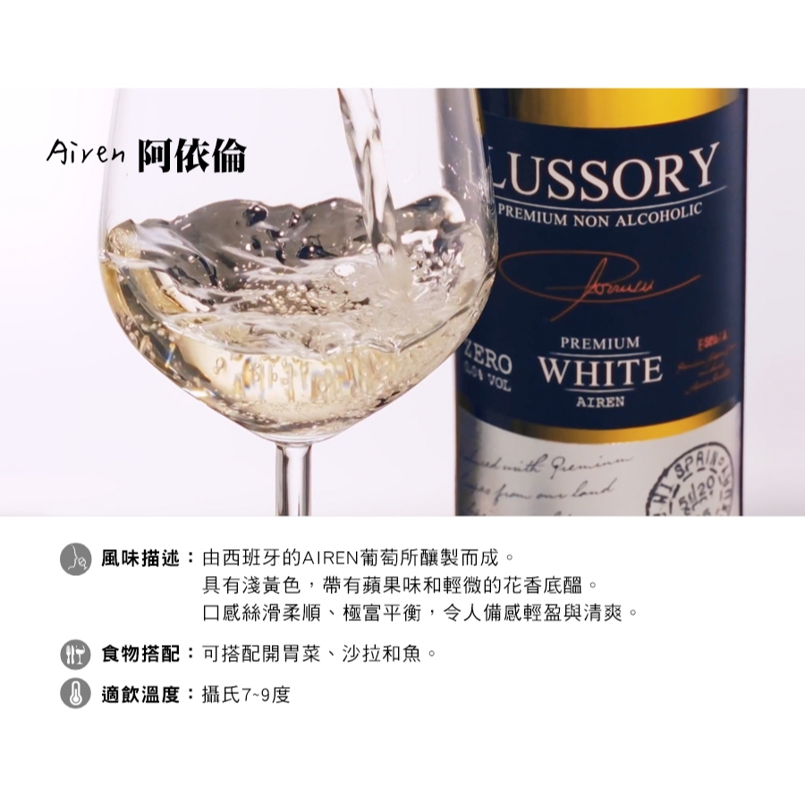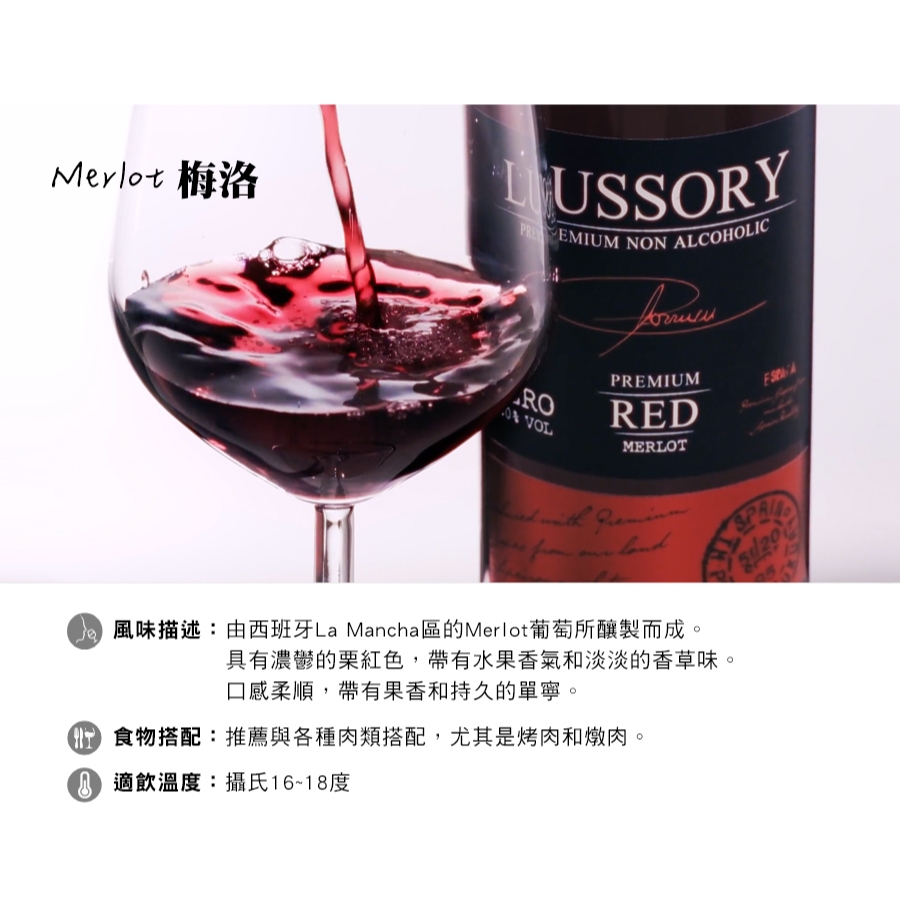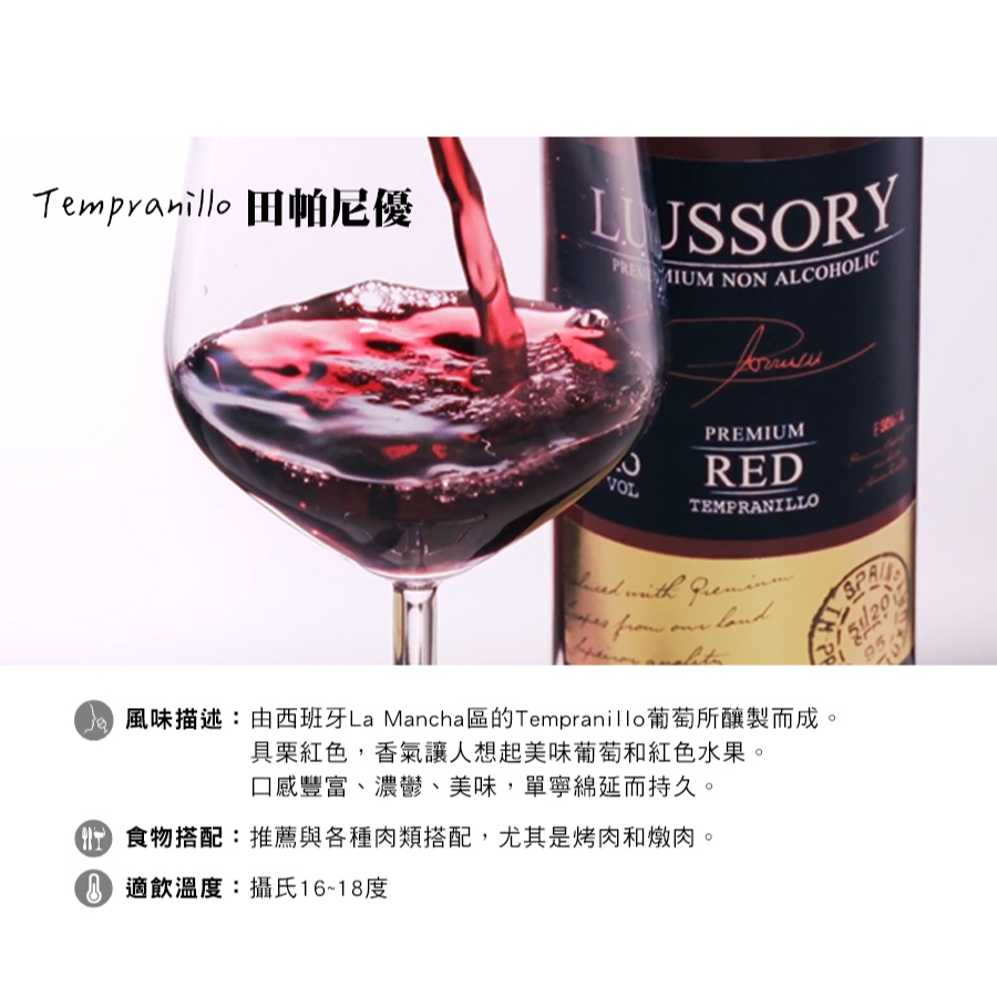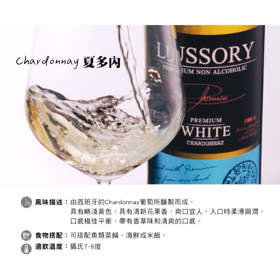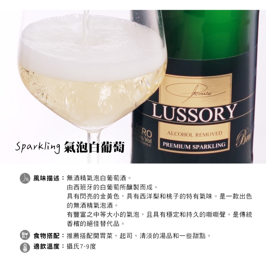 LUSSORY 路莎莉-無酒精紅酒/白酒/氣泡酒(VEGAN全素食可飲用)Tempranillo 田帕尼優|Merlot 梅洛|Airen 阿依倫|Chardonnay 夏多內|Sparkling 氣泡白葡萄Carbonated Drinks & Tonics小旭山脈 SUNSHINE RANGE
