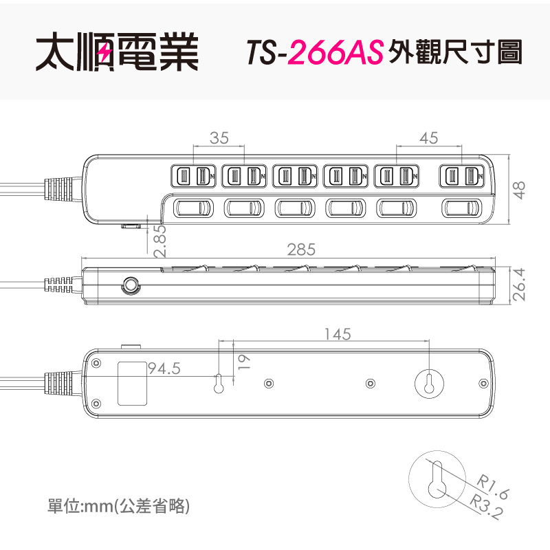 太順電業延長線 266AS 2孔6開6插 延長線插座 2.7M/3.6M/4.5M 扁頭延長線