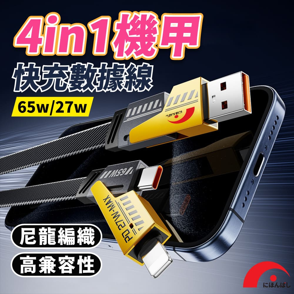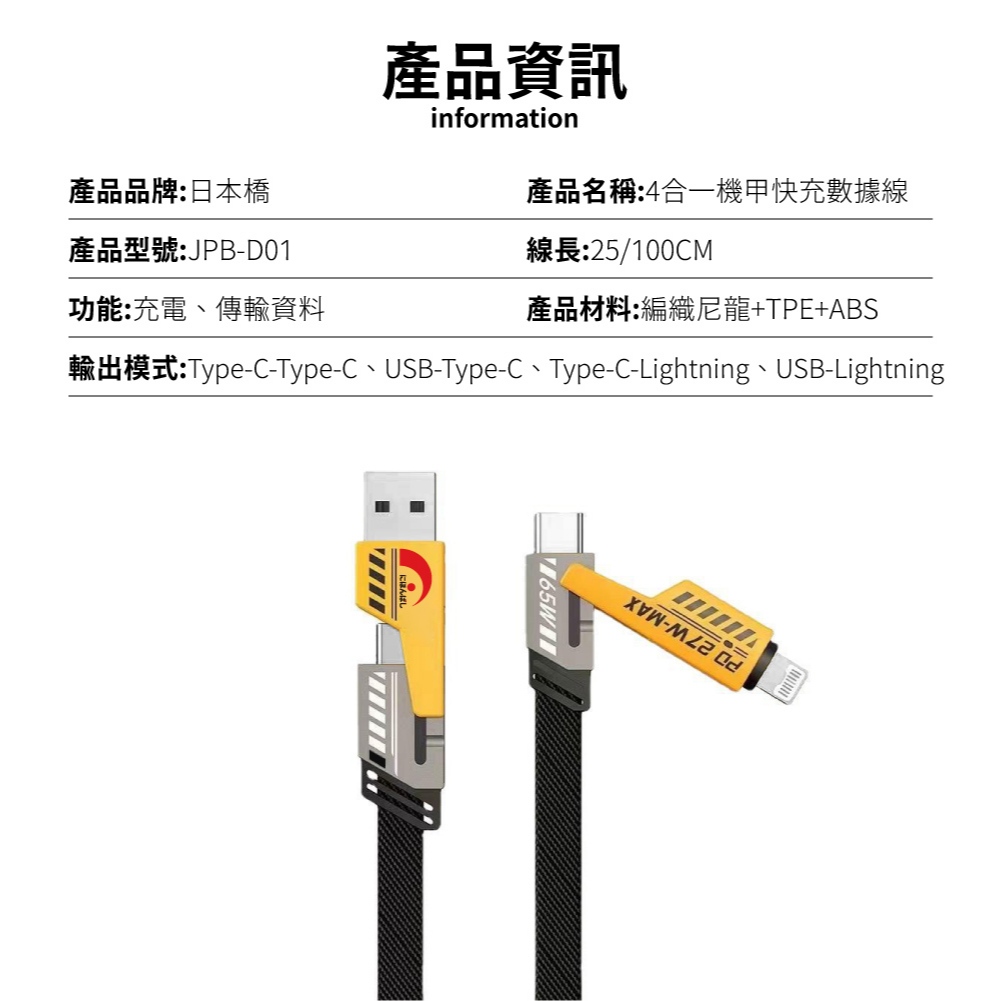 台灣公司貨【JPB】機甲四合一65W充電線/數據線 Lightning Type-c 傳輸線 PD快充 快充線新款-四合一機甲線 25cm(短線)|新版-四合一機甲線 100cm|新版-四合一機甲線 200cmCables, Chargers & Converters日本橋資訊廣場