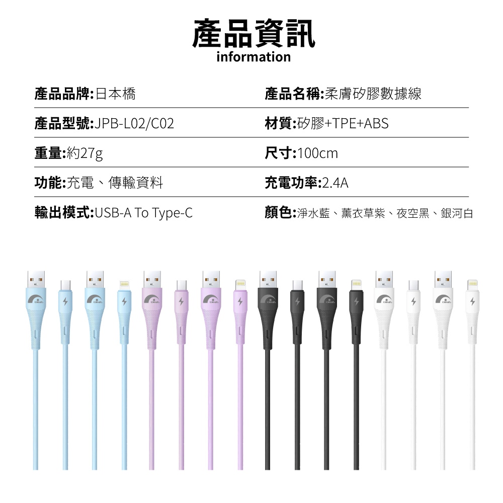 現貨【JPB】柔膚矽膠充電線/數據線 1m Lightning Type-c 傳輸線 PD快充 現貨白色,Lightning|白色,Type-C|藍色,Lightning|藍色,Type-C|黑色,Lightning|黑色,Type-C|紫色,Lightning|紫色,Type-C|顏色隨機,Lightning|顏色隨機,Type-CCables, Chargers & Converters日本橋資訊廣場