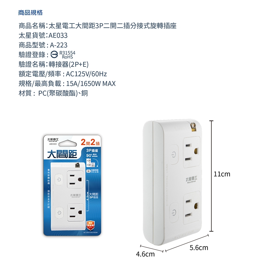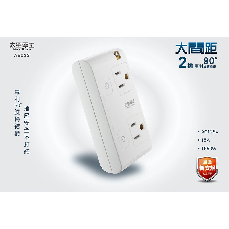 太星電工大間距3P二開二插分接式旋轉插座 AE033太星電工大間距3P二開二插分接式旋轉插座 AE033Electric Sockets & Extension Cords太星旗艦店
