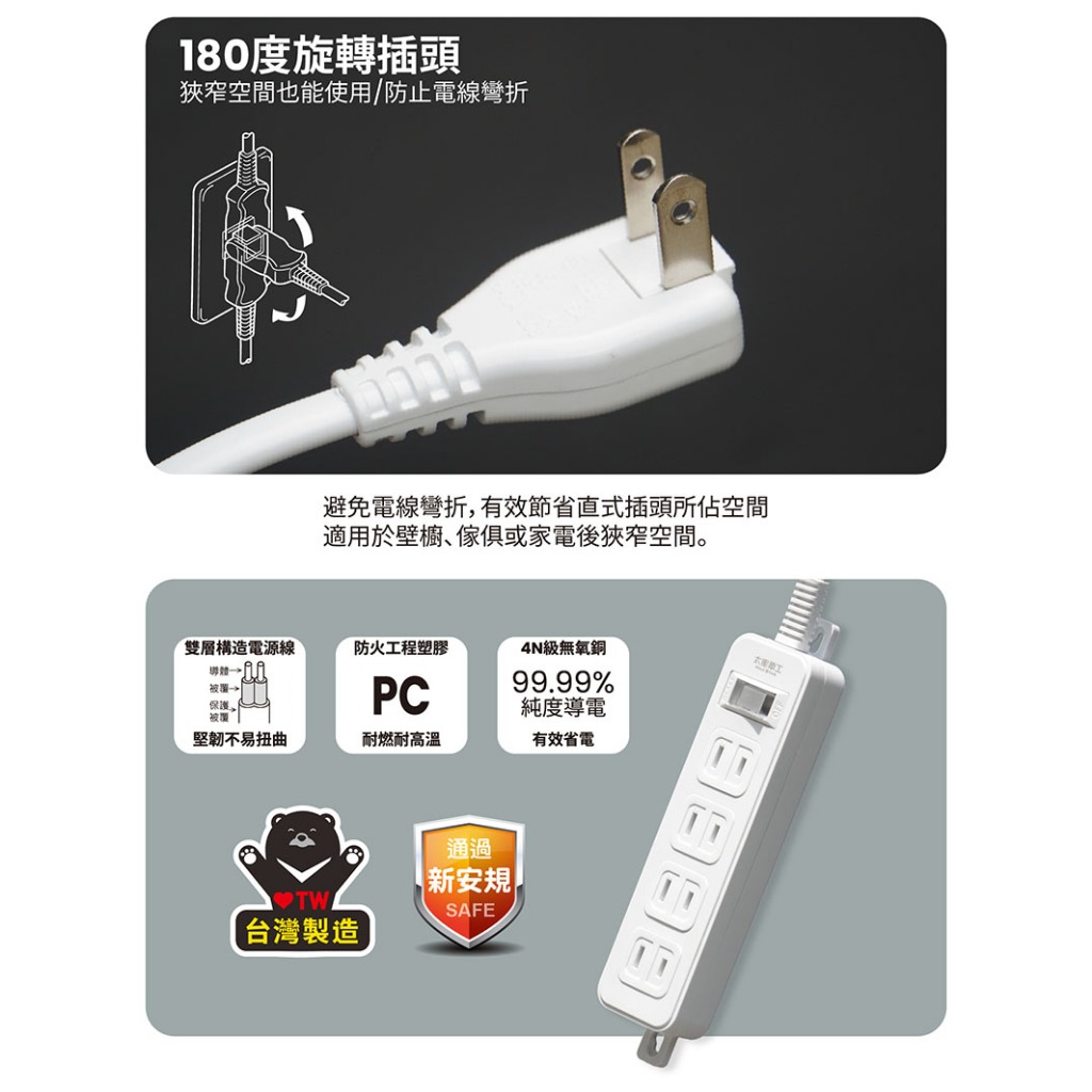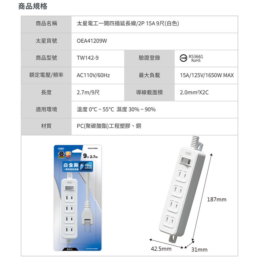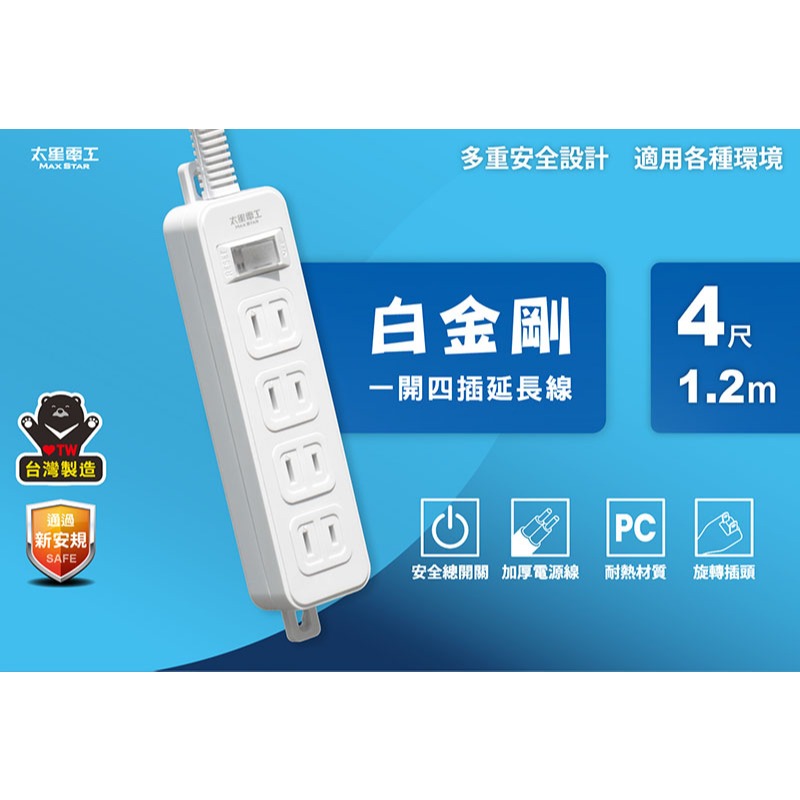 【太星電工】一開四插延長線/2P 15A 4尺/6尺/9尺(白色)總開關 過載保護 台灣製 壁掛 旋轉插頭 白金剛9尺/2.7m|4尺/1.2m|6尺/1.8mElectric Sockets & Extension Cords太星旗艦店