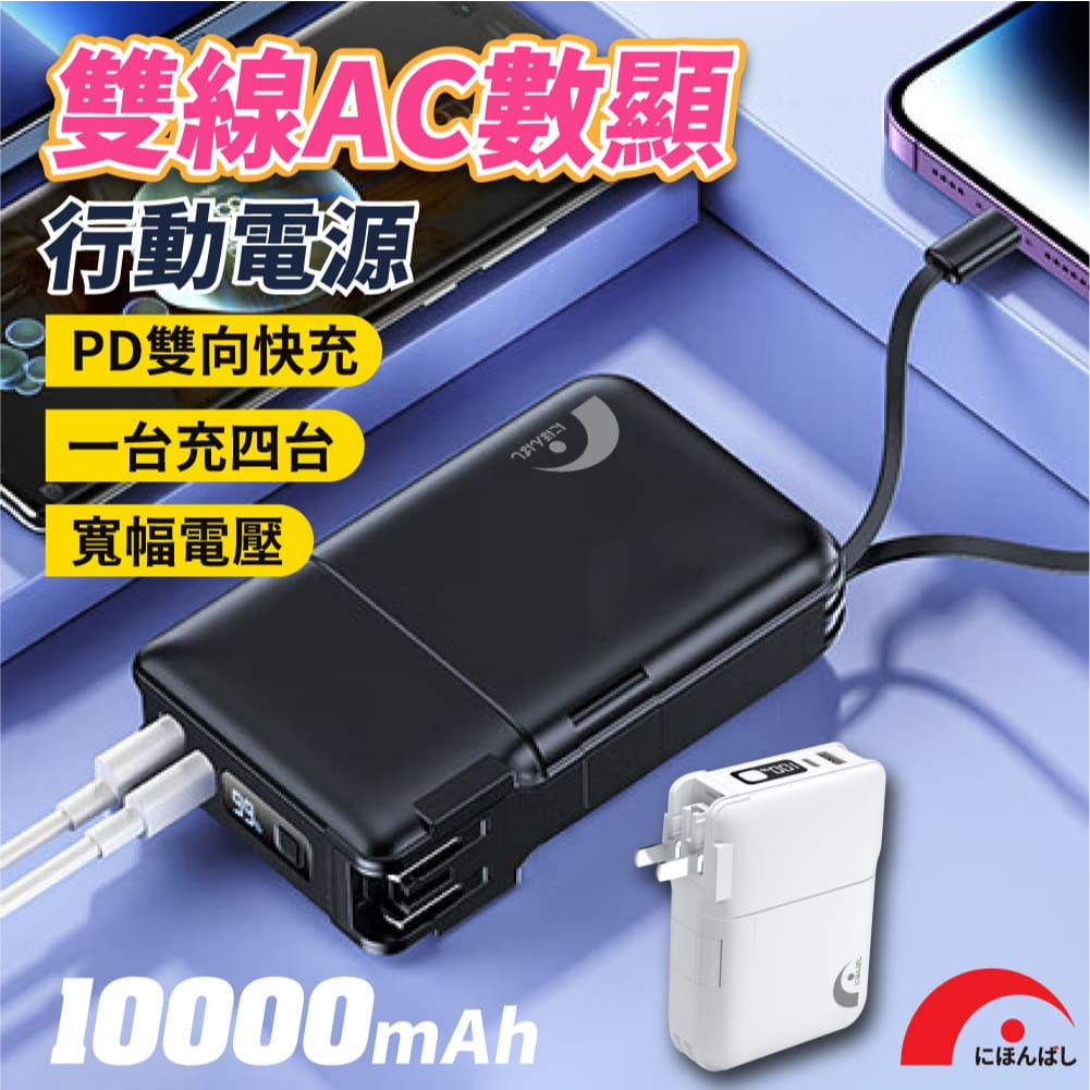 【JPB】 多合一自帶雙線/AC充電器行動電源 蘋果/Type-C 10000mAh黑色|白色Powerbanks & Batteries日本橋資訊廣場