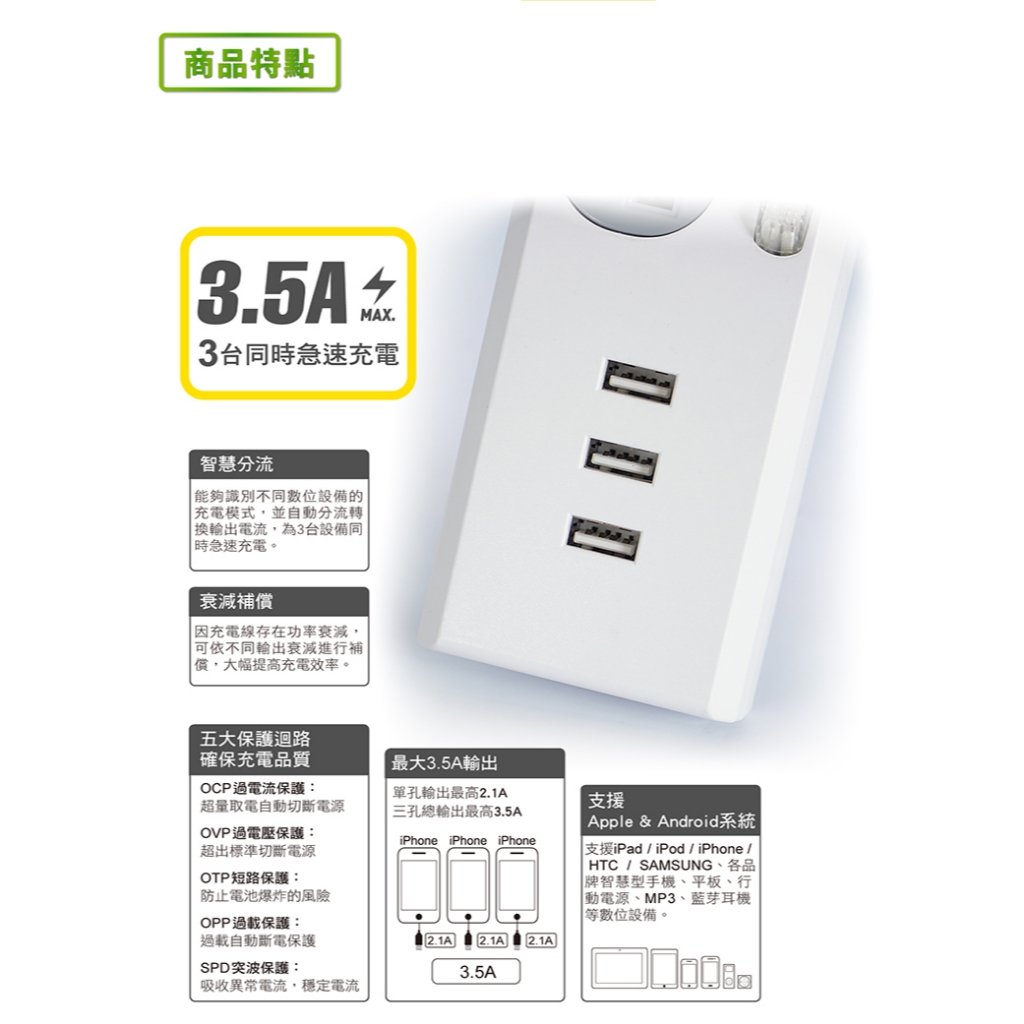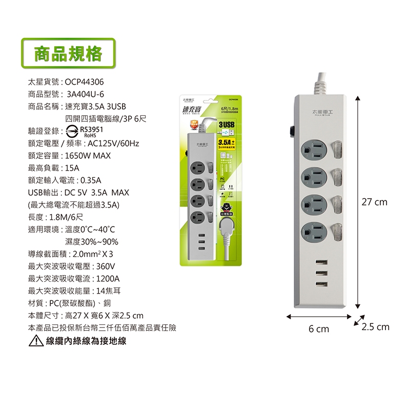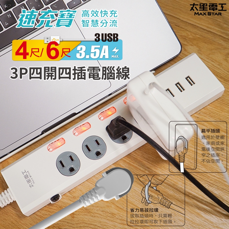【太星電工】速充寶3.5A 3USB四開四插電腦線/3P(4尺/6尺)/延長線/開關/充電/手機充電/過載保護/台灣製造6尺(180cm)|4尺(120cm)Electric Sockets & Extension Cords太星旗艦店