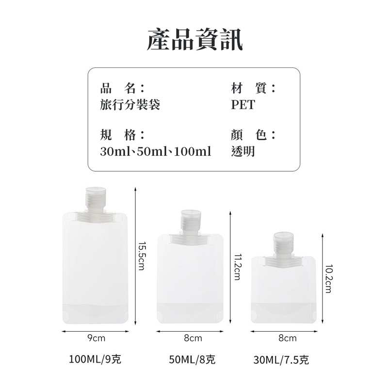 【台灣現貨】旅行分裝袋 液體分裝袋 旅行分裝瓶 分裝瓶 乳液瓶 盥洗分裝袋 透明分裝袋 輕巧分裝袋 分裝萬用袋旋轉式開蓋|旅行分裝袋30ml|旋轉式開蓋|旅行分裝袋100ml|掀蓋式開蓋| 旅行分裝袋50ml|掀蓋式開蓋| 旅行分裝袋100ml|【瑕疵出清】旋轉開蓋30ml|僅瓶口髒污Travel Size Bottles & Containers日初良食-窈窕輕生活的好朋友