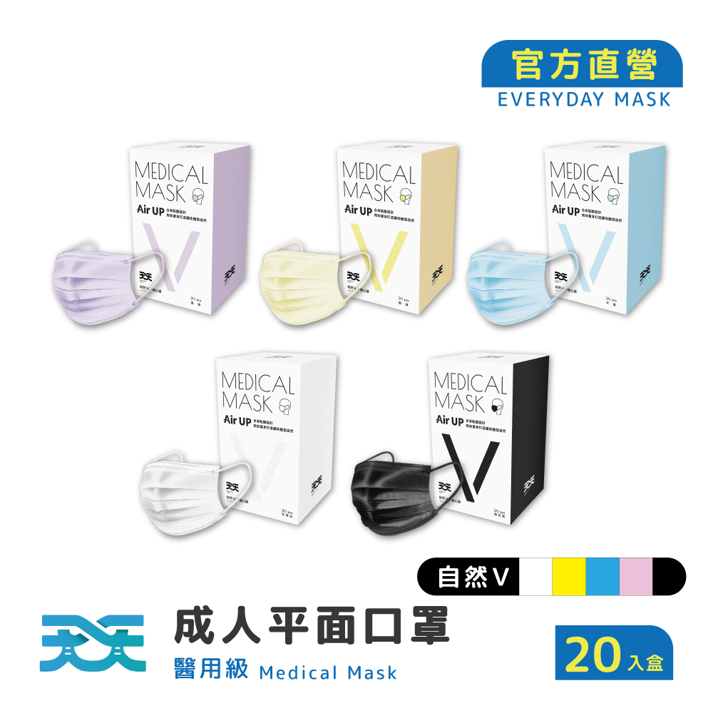 【天天】成人平面醫用口罩 自然V系列 (20入/盒) (修飾臉型/適用小臉者) (5色可選)隕石黑|珍珠白|鵝黃|漫紫|天藍Medical Gloves & Masks天天防護口罩