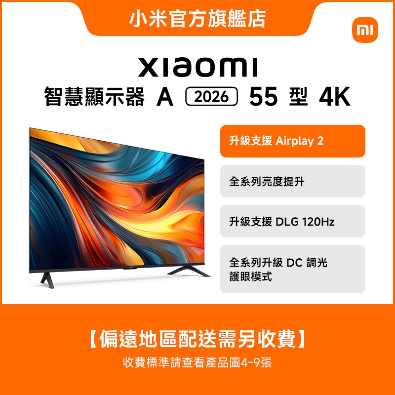 Xiaomi 智慧顯示器 A 2026 55型 4K -偏遠地區配送收費標準詳見圖文內容Xiaomi 智慧顯示器 A 2026 55型 4K -偏遠地區配送收費標準詳見圖文內容TVs小米官方旗艦店