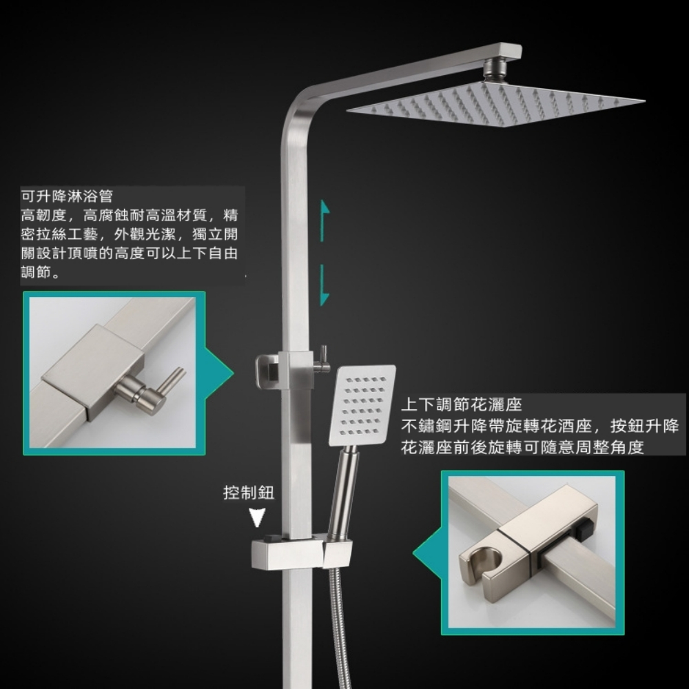 【小山】304不鏽鋼四方淋浴花灑套裝冷熱手提式升降頂噴沐浴花灑套裝 蓮蓬頭 淋浴柱方形大淋浴套裝Showerheads & Bidet Sprays小山品牌旗艦店