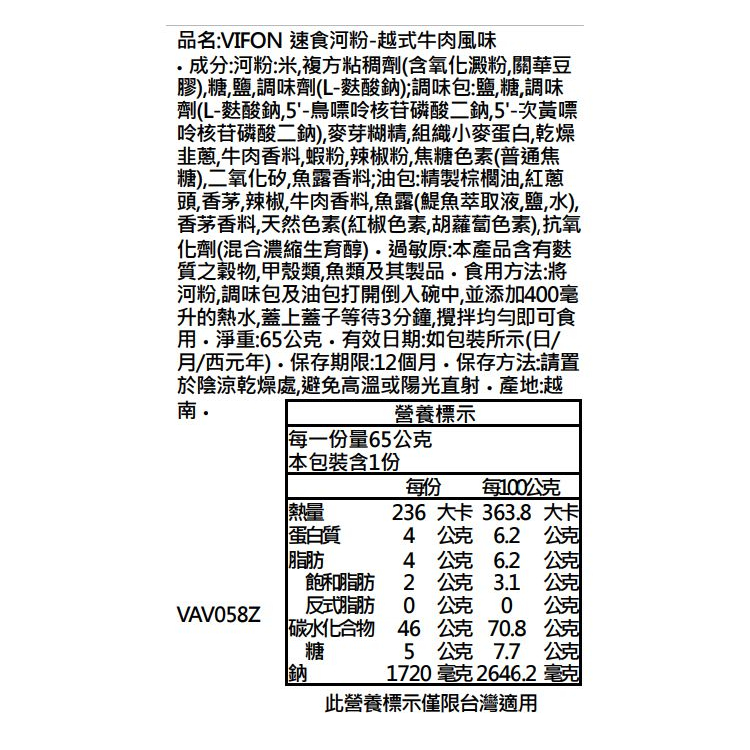 VIFON 速食河粉 越式牛肉風味65g(Bun Bo Hue)【小三美日】 DS015500單一Instant Noodles小三美日