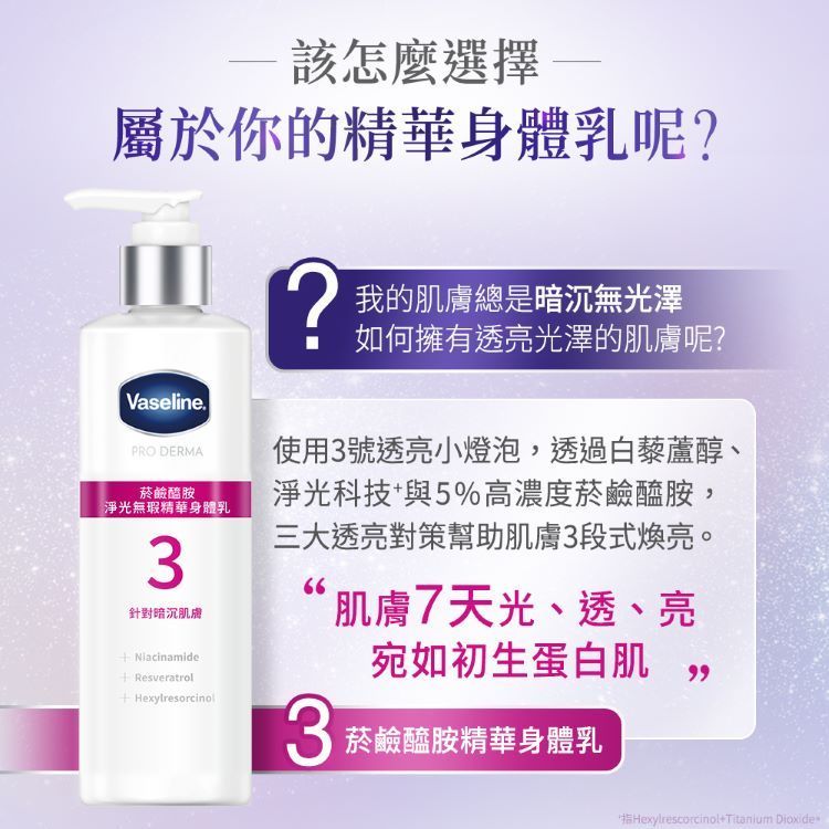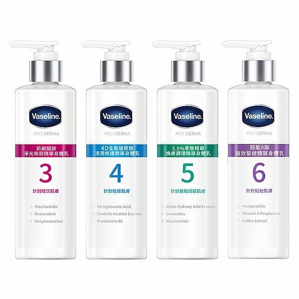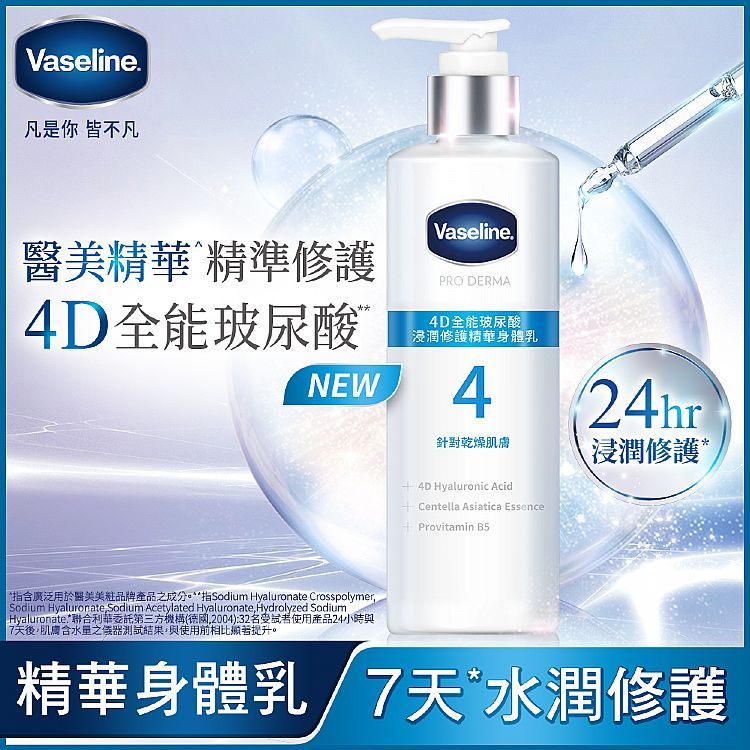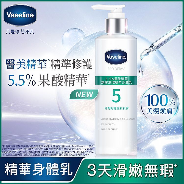 Vaseline 凡士林 全能精華身體乳(250ml) 款式可選【小三美日】DS011577超能A酯-極效緊緻|菸鹼醯胺-淨光無暇|4D全能玻尿酸-浸潤修護|5.5%果酸精華-煥膚調理Body Cream, Lotion & Butter小三美日