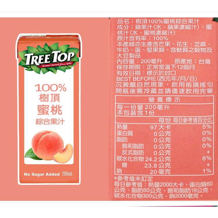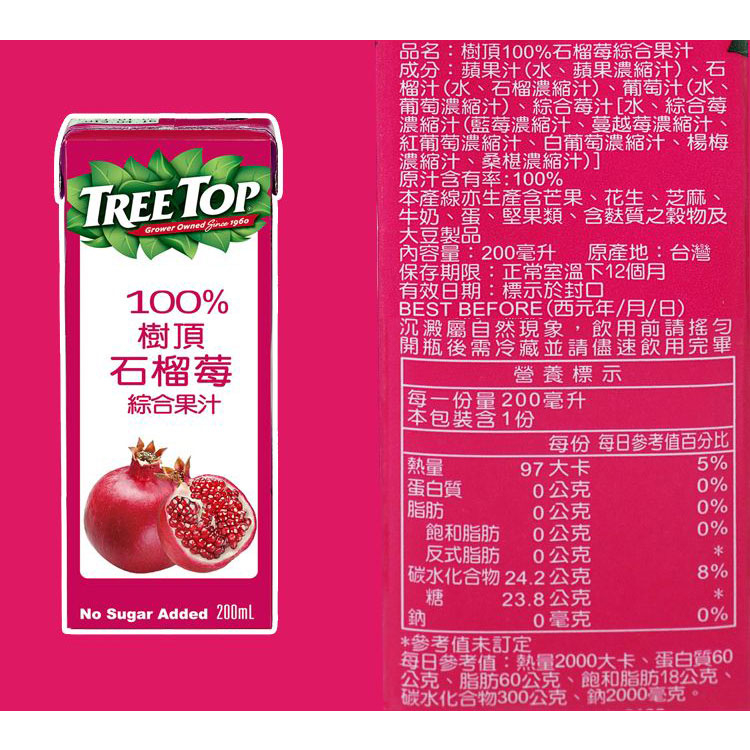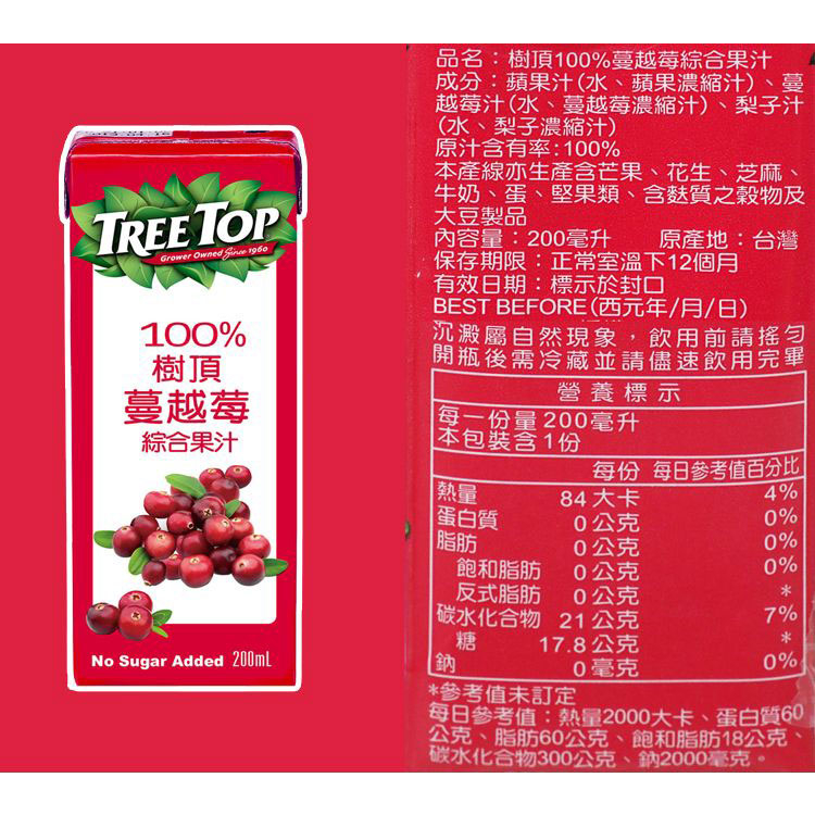 Tree Top 樹頂100% 石榴莓/蜜桃/蔓越莓 綜合果汁(利樂包)200ml 果汁【小三美日】DS014291x石榴莓|蜜桃|蔓越莓Juice & Juice Vinegar小三美日