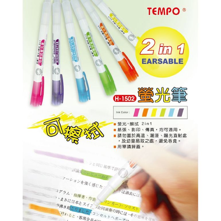 Tempo 節奏 螢光筆 自動柔和色 Fantasy 可擦拭 雙頭 軟性 手帳 重點 影印【小三美日】DS024216x可擦拭H-1502(黃色)|可擦拭H-1502(粉色)|可擦拭H-1502(綠色)|可擦拭H-1502(紫色)|可擦拭H-1502(橘色)|可擦拭H-1502(藍色)|雙頭H-1515(黃色)|雙頭H-1515(橘色)|雙頭H-1515(粉色)|雙頭H-1515(綠色)|雙頭H-1515(藍色)|雙頭H-1515(紫色)|雙頭-H-1510-01(紅)|雙頭-H-1510-02(珊瑚粉)|雙頭-H-1510-03(杏桃桔)|雙頭-H-1510-04(灰)|雙頭-H-1510-05(金黃)|雙頭-H-1510-06(檸檬黃)|雙頭-H-1510-07(藍)|雙頭-H-1510-08(深藍)|雙頭-H-1510-09(紫)|雙頭-H-1510-10(灰藍)|雙頭-H-1510-11(藍綠)|雙頭-H-1510-12(綠色)|FantasyH-105(橘色)|FantasyH-105(綠色)|FantasyH-105(藍色)|FantasyH-105(紫色)|柔和色H-200-01(檸檬黃)|柔和色H-200-02(淺粉色)|柔和色H-200-03(淡橘色)|柔和色H-200-04(薄荷綠)|柔和色H-200-05(藍綠色)|柔和色H-200-06(丁香紫)|FantasyH-105(黃色)|FantasyH-105(粉色)|軟性螢光筆H-204(黃色)|軟性螢光筆H-204(粉色)|軟性螢光筆H-204(橘色)|軟性螢光筆H-204(綠色)|軟性螢光筆H-204(藍色)|軟性螢光筆H-204(紫色)Highlighters小三美日