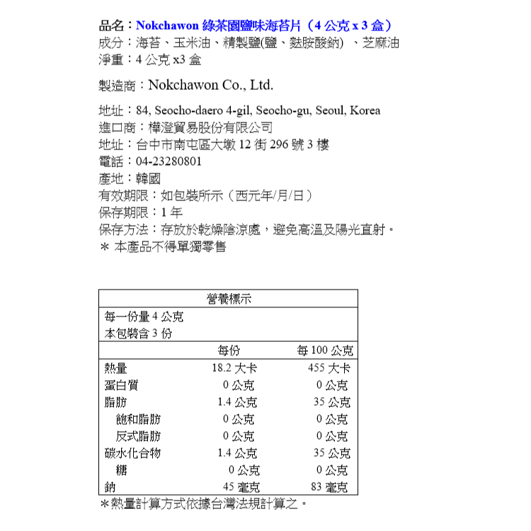 韓國 NOKCHAWON 綠茶園 鹽味海苔片(4gx3盒/袋) 薄鹽調味 鮮香脆 食品 拌飯【小三美日】DS025005單一Seaweed小三美日