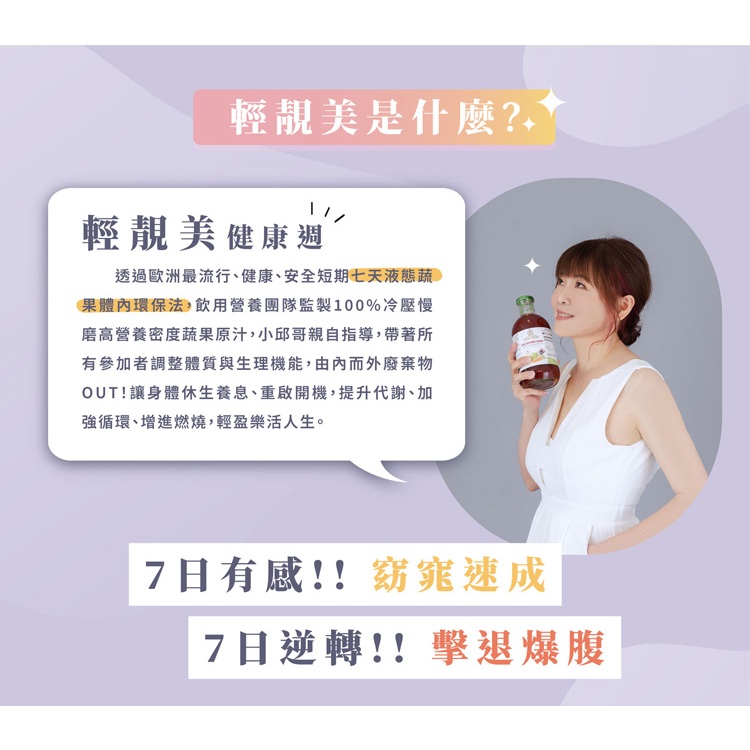 7日輕靚美健康週 小邱哥指導 千人口碑有感評價 代餐 高酵蔬果汁 調整體質 代謝循環 植化素第41梯6/21開團,綠色蔬果5+紫色蔬果5|第41梯6/21開團,綠色蔬果5+紅色蔬果5|第41梯6/21開團,綠色蔬果5+黃色蔬果5Weight Management日華好物 / 輕靚美7日健康週-體態管理專家