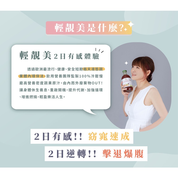 輕靚美2日有感體驗組 一週2日快速甩掉 蔬果療法 高酵蔬果汁 調整體質 啟動代謝循環 速成 燃燒 代餐 日華好物 小邱哥2.循環速成組|3.攝守速成組|4.私密速成組|5.養顏速成組|6.氣色速成組|7.高抗速成組|8.晶亮速成組|9.美型速成組|1.代謝速成組Juice & Juice Vinegar日華好物 / 輕靚美7日健康週-體態管理專家