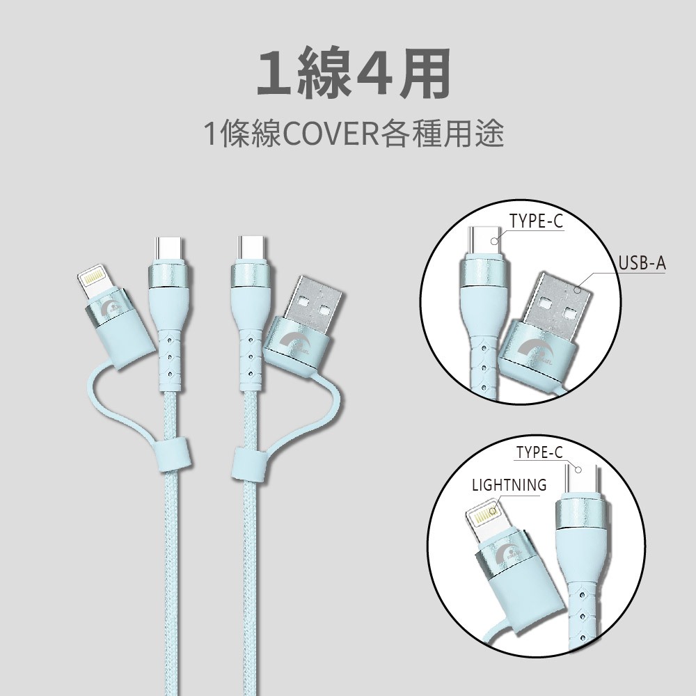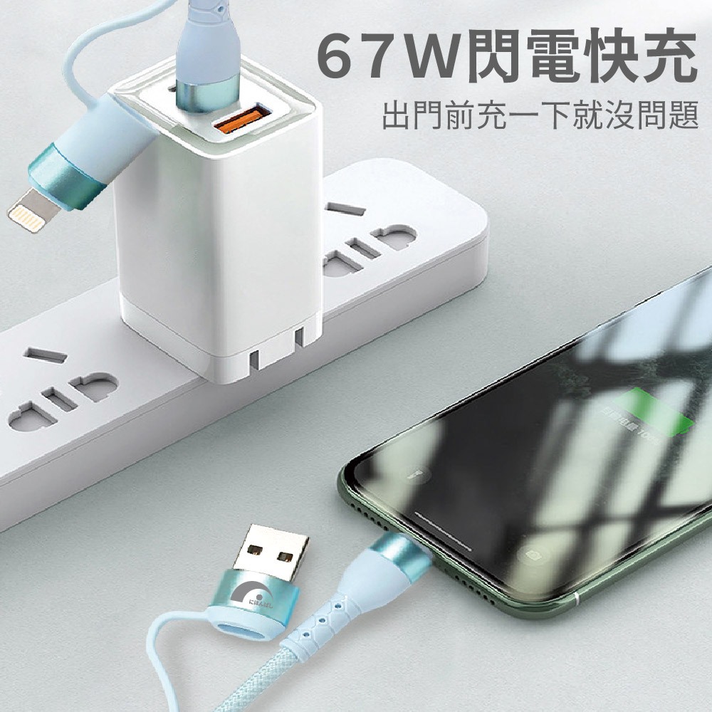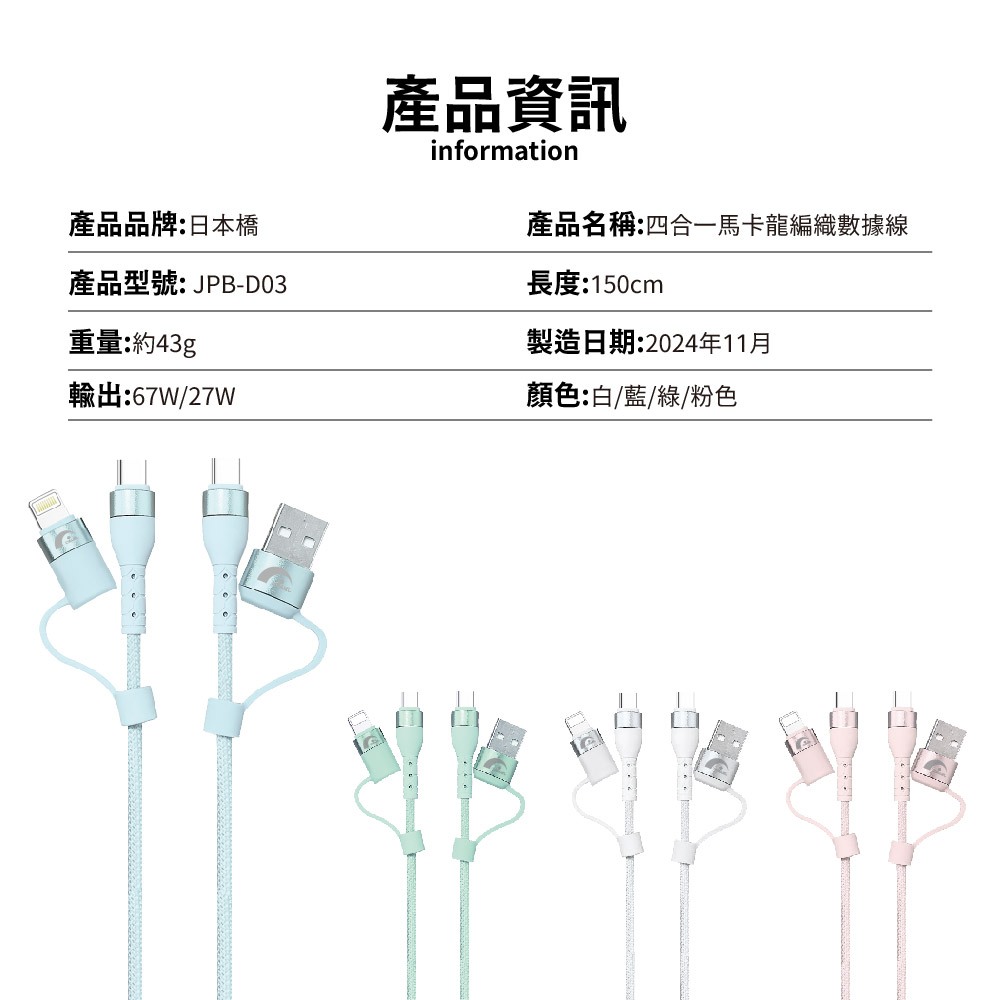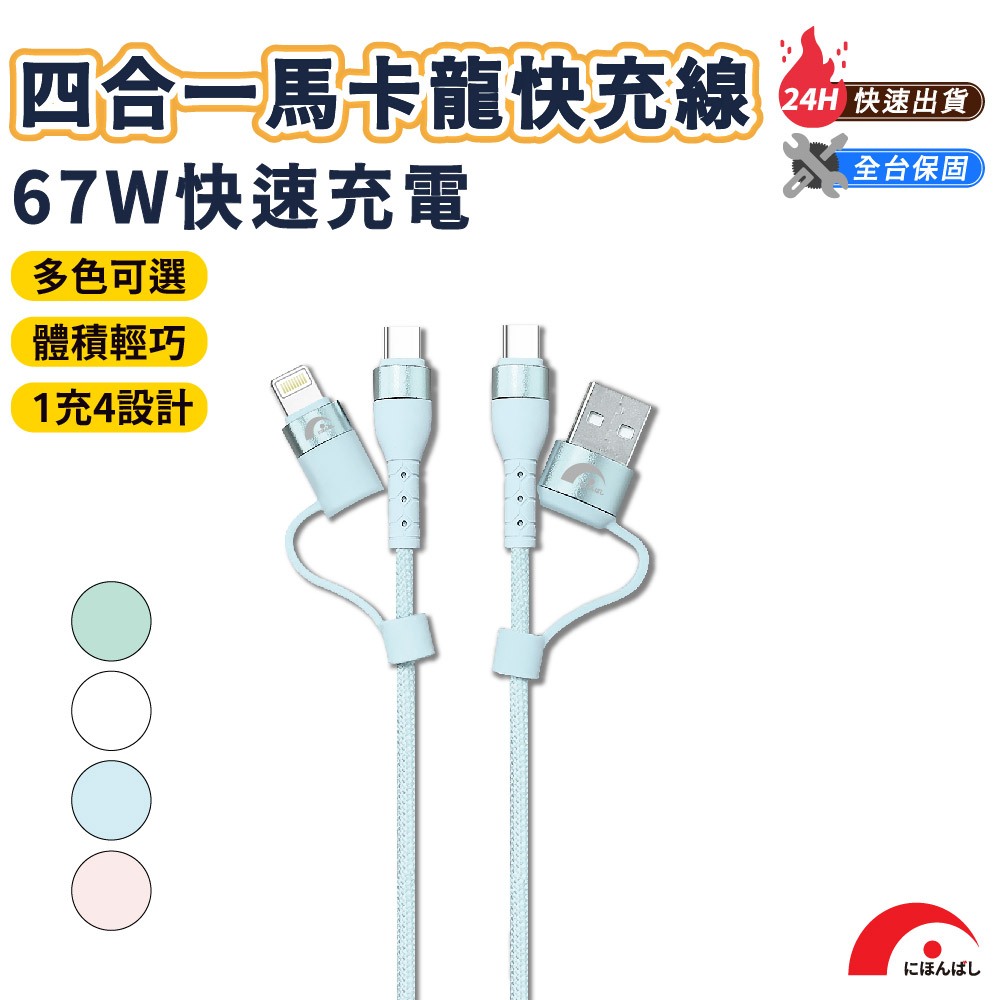 【JPB】67W馬卡龍四合一快充傳輸線1.5M Type-C Lightning PD快充 充電線 數據線 快充藍色|白色|綠色|粉色|隨機出貨Cables, Chargers & Converters日本橋資訊廣場