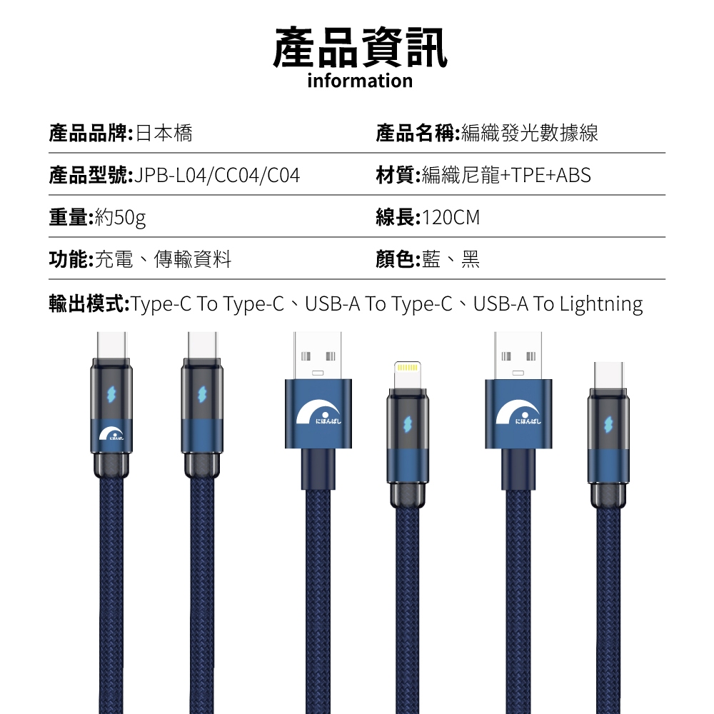 【JPB】PD60W編織發光 充電線/數據線 1.2m Lightning Type-c 傳輸線 PD快充Lightning對USB,藍色|Lightning對USB,黑色|Type-C對USB,藍色|Type-C對USB,黑色|Type-C to Type-C 60W,藍色|Type-C to Type-C 60W,黑色Cables, Chargers & Converters日本橋資訊廣場