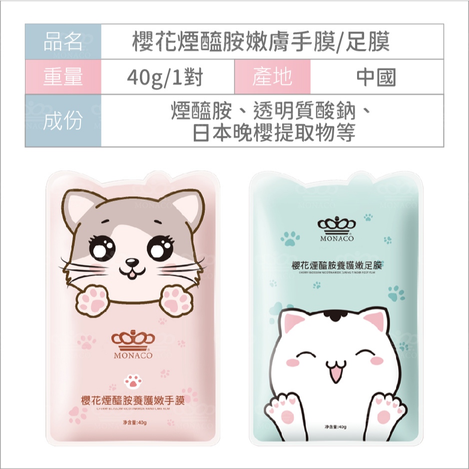 魔娜歌 貓咪 櫻花煙醯胺 手膜 足膜∣18cm X 11cm∣貓爪手膜∣可觸屏×一次性手膜×護手×護足×嫩膚《ER》1對-手膜|1對-足膜Hand Care日本商 魔娜歌|乳清蛋白 保健食品